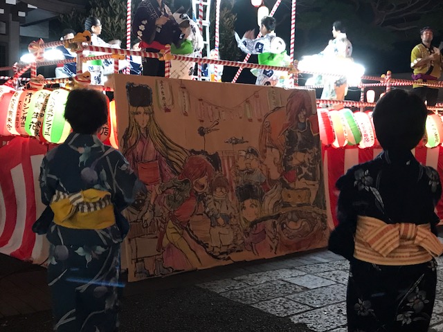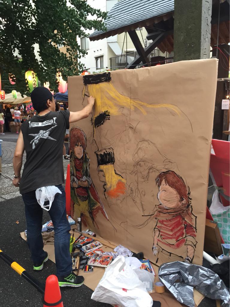 いや大きいと言う程でもないサイズだが。 銀河の夜の盆踊り大会で描いてきた。 暑かったが今回は普通に暑いだけだったのでよかった。 以前(2年前と3年前)は倒れそうな程の暑さと直射日光だったからなぁ。 人がたくさん来る頃には、後ろに下がって構図を考える事が出来なくなるので 16時に開始の予定だったが、30分程早めに描き始める。 「盆踊り風にならないだろうか」という商店街からの希望に応え、メーテルには浴衣を着せてみた。 さてこの後どうすれば良いだろうと、少し考え込む。相変わらず無計画だ。 お客様からの差し入れをいただいたり冷たいお茶を何本も飲んだりヤキソバを食べたりしながら描いて、気がついたら大体できあがった。 このあたりで一昨年のように、パネルが寄付金の札でいっぱいになったので、絵は撤去される事になる。 今回はこの事態を見越し、紙をスタイロホームの土台に貼り、移動できるようにしてあったのだ。 19時前で少し早かったが、予定通りヤグラの下に置かれることになった。 実はまだ完成していないんだが、これ以上手を入れてもそんなに変わらないだろうからこれくらいにしておいた。 その後は絵の回りを囲んで盆踊りが始まり 和太鼓が叩かれたり 絵の上で区議員の人が挨拶したり 歌手の人が歌って、見ていた子供たちが踊ったり また盆踊りが始まったり 自分が描いた絵の周囲でこんな儀式が続く光景はなんだか不思議で面白可笑しいものだった。 今年は松本先生と会えなかったのが残念だ。 1日経った今は筋肉痛なので自宅で安静にしている。