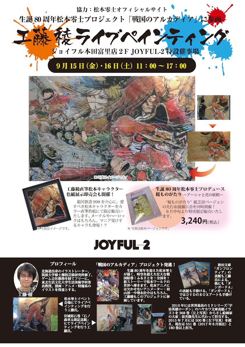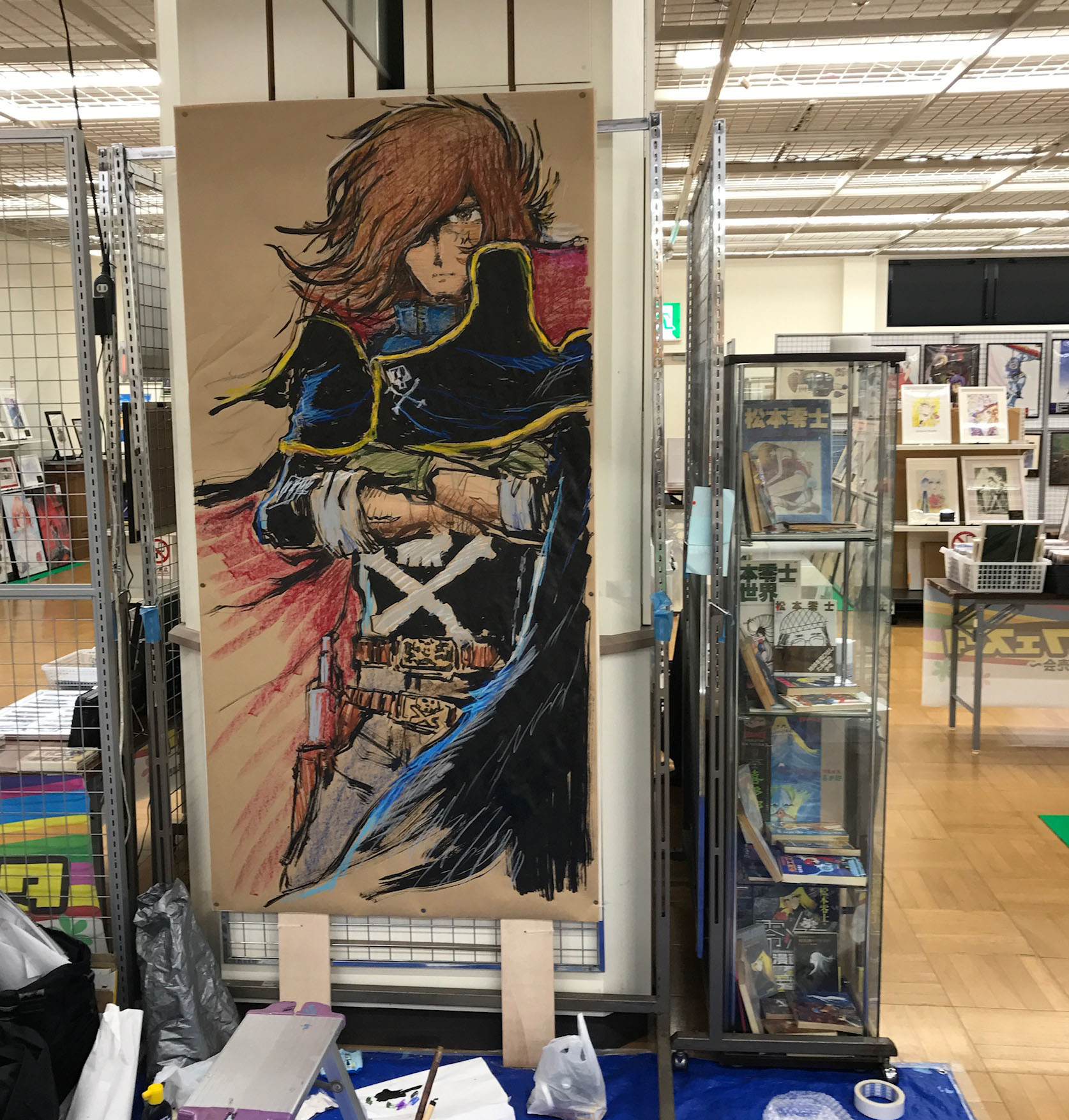 彼は以前、僕の絵のジクレー(注 版画みたいなもの)を売り出そうとサンプルまで作ってくれた事があるが、残念ながら形にはならなかった。今回のライブは再度企画を立てるためのデモンストレーションなのだろうと思っている。 「交通費と宿泊費は出せるがすまない、工藤に支払うギャラが無いのだ」 「そうか。」 「工藤に色紙を描いて貰って、それの売上げで君のギャラにしたい」 「わかった」 というわけで前もって描いたのが以下の十数枚だ。 売れるかどうかは別にして、それを飾っていたら絵が出来上がる前の賑やかしになるし、自分の練習にもなる。キャラクターの版権的には、松本零士公式サイトさんの御協力をいただいた。 そして2日目。 昨日の店員さんが、高校一年の息子さんに見せたいと、休暇の日だというのに来てくれた。 息子は美術部だというので、彩色を手伝ってくれるようお願いしてみた。 上手かったので、細部の描き込みもいくつかお願いした。僕は少し休む事が出来た。 ありがとう。 館内放送では十数分おきに、僕が描いている事を紹介してくれていた。 ときどきT原君がマイクを持ちながらすぐ後ろで実況放送をしていた。 「工藤がたった今描き終わったのは、ガンフロンティアのトチロー、ハーロック、シヌノラの三人です。工藤はこのガンフロンティアの文庫本の装丁画を担当しております。次の絵に取りかかりました。何を描いてくれるのでしょう。そろそろメジャーなキャラクターを描いてほしいところです。」 有名キャラか。では、ということでエメラルダスに取りかかる。 途中で昼食をとり、本日最後の1枚を描きはじめた。 絵としてまとめる事など考えず、適当に自分が楽しめる物にしよう。 大山一族勢揃いなんて楽しそうだ。 大山だけではなく足立、山本、井台もいるだろう。似たような顔ばかりでいいぞ。 と考えていたが、気がついたらワダチになっていた。 ワダチは面白いからなぁ。仕方ないな。 というところで時間になり修了。 とくに余韻はなく、片付けて帰ったのだった。 企画してくれたT原君、 ジョイフル本田の皆様、 観に来て下さった皆様、励まして下さった皆様、 そして購入などとという物凄い事をして下さった皆様、 ありがとうございます。 感謝の言葉もありません。 描いた絵や残った色紙は、このあとジョイフル本田富里店2Fの催事場あたりにしばらく飾ってくれるそうです。ありがたい事です。 9月15〜16日、ジョイフル本田、千葉の富里店で絵を描いてきた。 公式の協力をいただいて、陽の当たるところで堂々と松本キャラを描いてきたのだ。 (練馬の盆踊りも許可はいただいて明るいところで堂々と描いてはいますが。) 自宅から電車で2時間、そこから車で十数分、自分が一体何処にいるのかまったくわからないまま描きはじめた。 1枚畳大のサイズ。前もってこの3倍のサイズが描きたいとお願いしていた(それでも遠慮したサイズだ)が、直前になってこのサイズしか場所が準備出来ないと言う連絡があって困っていた。 さらに「大きな紙が無い」との事で、しかたないのでロール紙を探して買っておいたのだが、前日になって先方が「準備した」という話になり、連絡をこまめに確認し合う事の重要性を強く感じたのであった。 広報のレジにいた店員さんが「時々顔を上げると、どんどん変わっている。見ていると凄い早さで描き上がって行く。感激した」と言って下さった。 「これが見られるなんて、この仕事に入って今日ほどよかったと思ったことがない」と過分なお褒めのことばをいただいた。 いつものように無計画に描き進める。 通りかかったお客さんが励ましの声をかけて下さる。 今日の最後は、自分へのサービスで男おいどんを描く。 したから描いて行ったので、膝枕の女性を描こうと思ったのは途中からだ。 この女性は誰だろう。清水さんでも浅野さんでもないし、でも下宿にこんな人がいたような。 twitterで「西尾さん…」というコメントがついたので、何となくそんな気がする。 というところで1日目修了しました。 この地での作業は2日目に続くのだ。