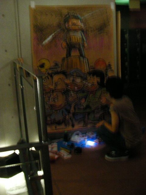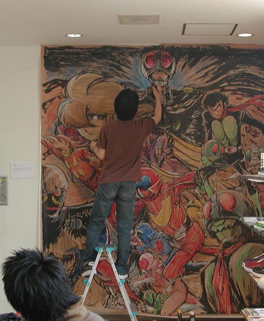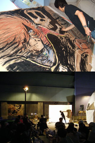 モチーフは、流れている歌やその時の特集に合わせたり合わせなかったり。 先日15日に描いたものである。 絵のサイズは、横幅1.3mくらい。縦の長さはいろいろ。 画像は携帯で撮ったり、各所のブログから拾ってきた物なので、サイズや写り方がまちまちなのを許して下さい。 描いている様子である。会場はかなり暗いので、クレヨンの色を確認するための懐中電灯は必須だ。(写真では明るく見えるが、これはデジカメの自動補正のせいで、本当はかなり暗いのだ。)高いところを描くための椅子も置いてあると助かります。 以下、過去のオタクロや野外ビヤガーデン等の様子です。(これもいろんなサイトから拾って来たものが多いので、明るさやサイズがバラバラですみません。) PR ![]()