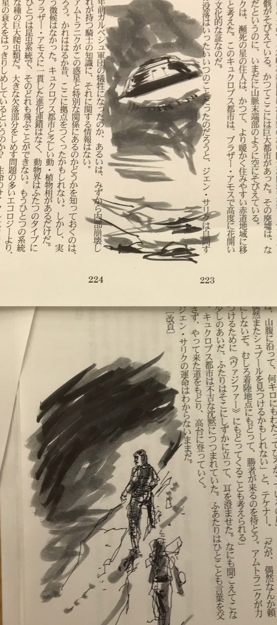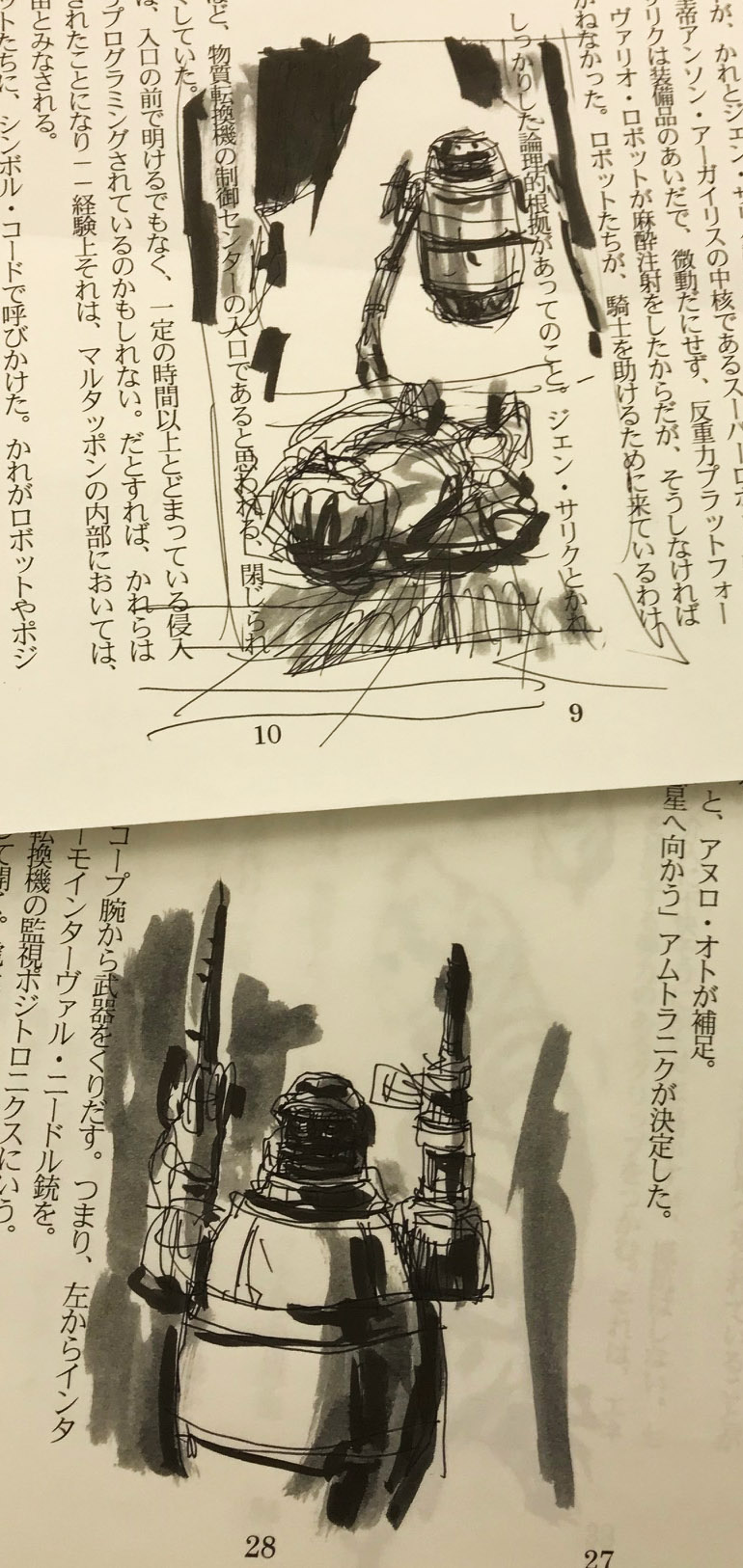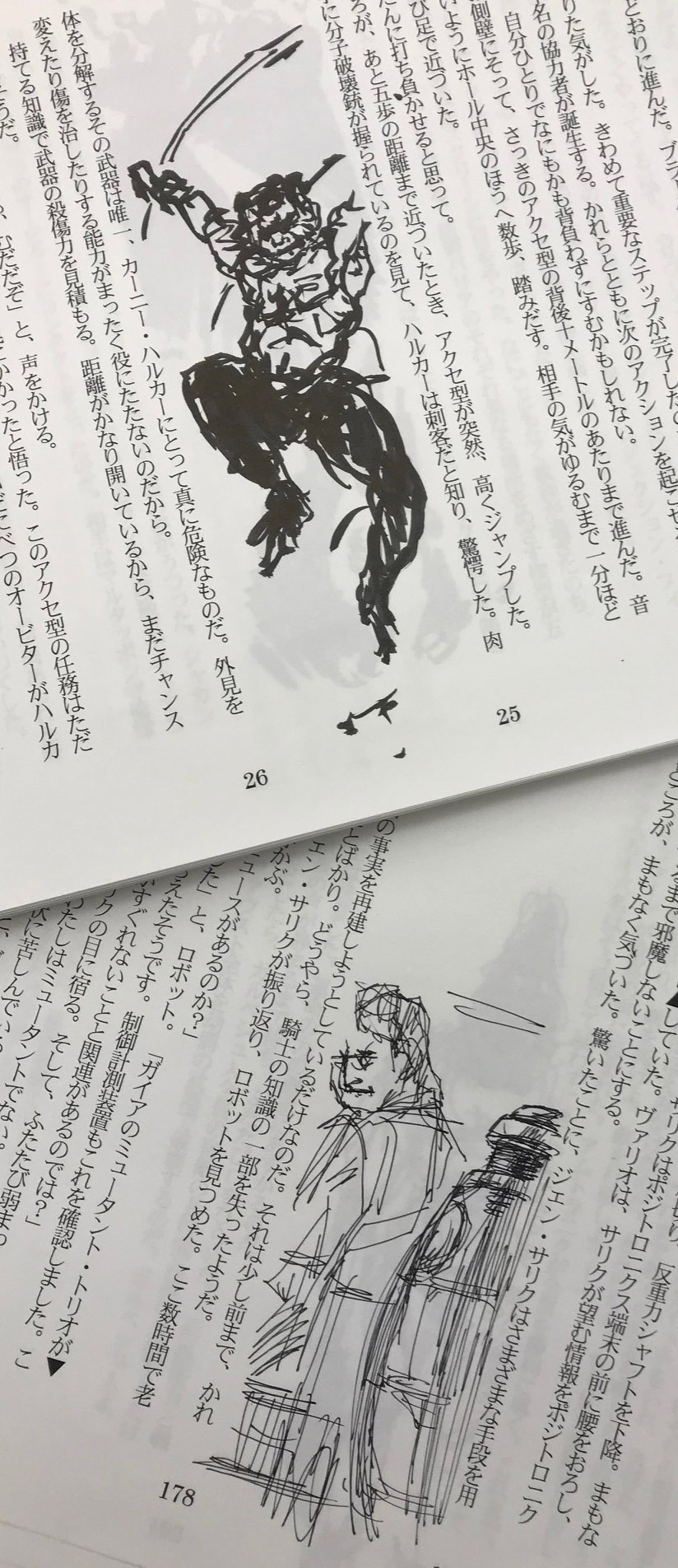 壁に展示している絵以外にも、いくつか置いてあります。 ぬりえ ローダンぬりえ、風雲児ぬりえ等を作ってみました。 もともとアートスクールの児童クラスの子たちに向けて作ったのですが ご希望の方がおられましたら塗っちゃって結構です。 色鉛筆も置いてありますので、好きなだけ塗って下さい。 塗った後は壁に貼って下さると嬉しいです。 ローダンイラストラフ 本文を読みながらメモ代わりに描いた絵がたまってしまいました。 もともと他人様に見せるつもりで描いたものではなく、 展示する程のものでもないので、束ねて机の上に置いてあります。 気になった方は手に取ってながめてやって下さい。 そんな感じで25日までやっています。 |