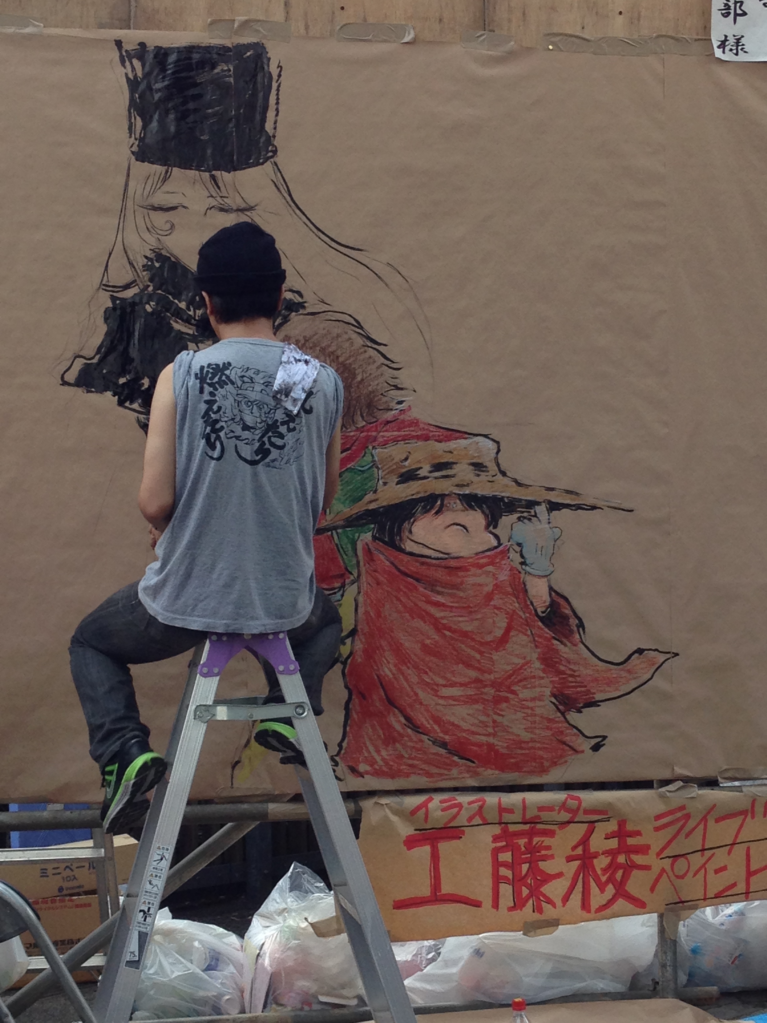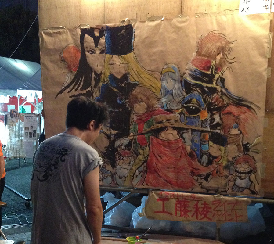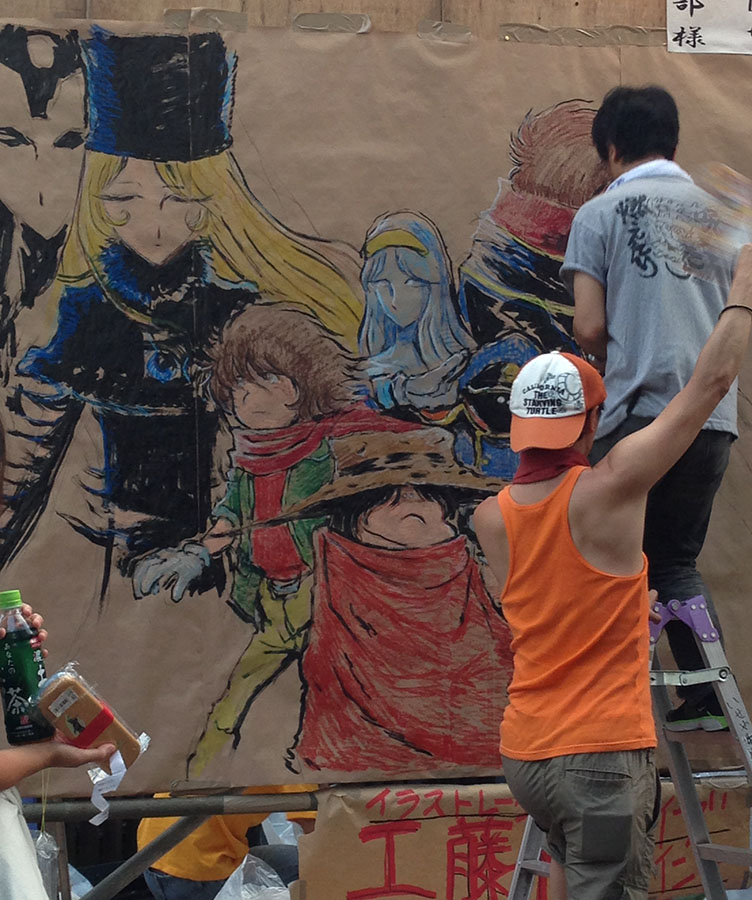 会場についただけでダウンしそうな暑さと湿度と日射しですが 「昨日のアレは想像以上だった。本当によかったと皆が言っている」 と褒められたのでやる気が出ます。 午後4時頃、作画開始。 とても暑いのですが、お客さんが涼しいスプレーをかけてくれたり 団扇であおいでくれるのでとても助かりました。 ときどきキャプテンハーロックが見守ってくれるので励みになります。 あぁ、俺よりも暑さに耐えている人がいるんだ、と。 しかし夜7時を過ぎたあたりで、エネルギー切れになったようです。 もうこのあと何を描けばいいのかわからない。 描こうとしても手が思うように動かない。 もう嫌だ、できん…… しかし絵を終わらせないと、見守ってくれている友人達も 帰るに帰れない様子なので、何とか完成させました。 最後に描きくわえた左下の、適当な機械伯爵と なげやりなリューズがこの絵のチャームポイントかも。 大会全体の2日目の様子は、ゆめーてる商店街公式サイトの 「イベント、お知らせ」にレポートが載っています。 http://oizumi.gr.jp/blog/2014/08/2014-08-01・02銀河の夜の盆踊り大会レポート。/ |