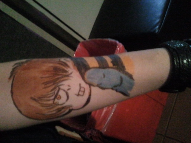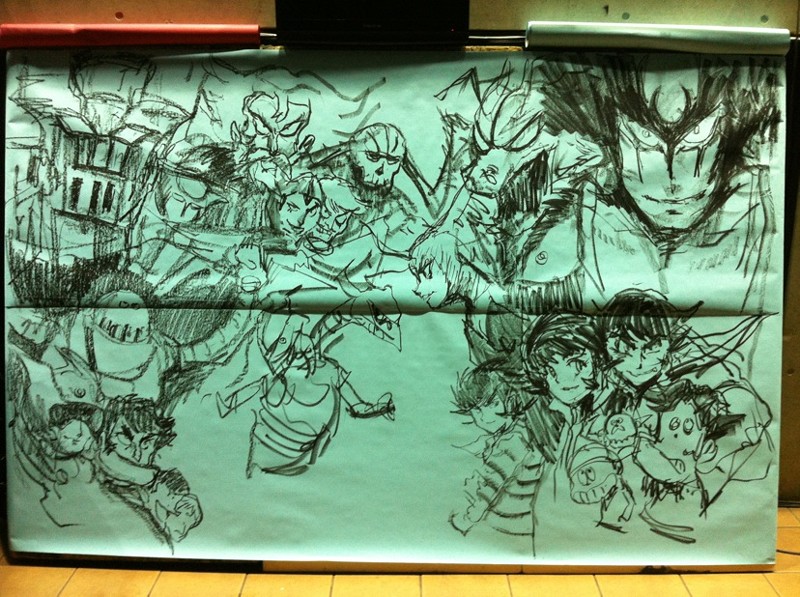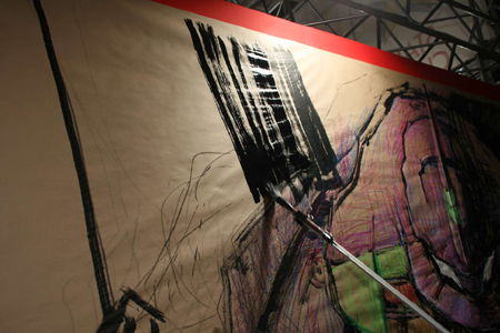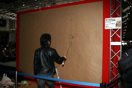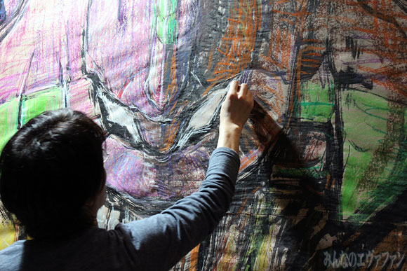 3月31日、『ACE(アニメコンテンツエキスポ)2013』の2日目に行き、スターチャイルドブースで昨年と同様でかい絵を描いてきた。 本来なら初日に描くべきだったのだが、川崎でオールナイトの歌謡イベントがあったので さすがに徹夜明けでこの仕事はできないと思い、一日ズラしてもらったのだ。 『Q』の新エヴァとか弐号機ビーストモードとかを描こうかと色々考えていたのですが、前回に続いてエヴァ初号機を描いたのは、先方からの依頼であるのです。 今回は公式サイト等での前もっての告知は一切無く、スペースの隅にこういう張り紙があっただけなのですが それでもこれを見つけてわざわざ取材に来てくれた毎日新聞の記者さんには大感謝であります。 12時頃開始とありますが、早めに着いたので11時半すぎに始めました。 今回より新兵器・アルミの棒を導入。 ホームセンターで見つけて、なんとなくいいかもと思いついたのだ。 これの先に画材をつければ、離れたところから描けて、全体の形のバランスがとりやすいかもしれないと考えたのです。 クリップ(強力洗濯バサミみたいなものです)で先端に木炭を装着。 たしかにこれは描きやすい。 高いところも大丈夫。 2本つなげて2mにしてみたが、これは使いにくかった。 形をキチンと描くためには、やはり自分の手で描かなければ。 墨入れ開始 棒の先に筆を装着。届くところも離れて描く。 お客から『おースゲー』とか声が聞こえると嬉しくなる。 「まだまだ、色が入っていないからね」と答えると『えー色つくんだ〜!』と返ってきた。 水性クレヨンで彩色。色の濃淡で立体感や重量感を出す 3歳くらいの女の子がいちばん前で観ていたので 「大丈夫?つまんなくない?」と訊くと『大丈夫』と返事をくれた。 「こわくない?」『うん』「これ、何描いているかわかる?」『エヴァンゲリオン』「そうか、偉いな」 彩色後にも墨汁で影を強調 このあたりで喉が乾いたのでポケットに入れていたフリスクを探したが、 無い。忘れてきたようだ。近くにいたスタッフの人にアメか何か持っていないかと訊くが、無いと言う。近くにいたお客がのど飴をくれた。すごく助かった。 画面右半分が未決定なまま進めていたので、考え始める 高いところも棒で便利 反射光にオレンジをいれたらいい感じになった気がする。 この辺で約2時間経過。休憩をいただく。 トイレに行って手を洗い、控え室で飲み物をもらって戻ってきた。 気がついたらヤバラ君がいた。休憩前からずっと観ていたのだという。気付かなかったなぁ。 後半、あとは全体のバランスを見ながら細部を加筆したりいろいろ。 とくに大きな進展は無いが、こういう作業は大事なのだ。 それからヤバラ君を誘ってコーヒー飲みに出かけたり。 空けた左側に弐号機を描いてみたが、やはり後付け感があるのでやめる。 煙モヤモヤを描き足す。 初号機の口から蒸気が出ているようにしたかったが、上手くいっていないみたい。 あまり細かく描き足しても効果的ではないし、むしろ絵を壊すだけなので、ここいらで終了。 開始より3時間半ほど経っていた。 最後までいてくれた新聞社の人から取材を受ける。 昨日見つけた告知が気になり、検索して調べたら、こりゃぁ是非取材しなければと休日返上で来てくれたのだそうだ。ありがたいなぁ。 記事はこちら。 http://mantan-web.jp/2013/03/31/20130331dog00m200017000c.html 今日検索したら、もうひとつ記事を見つけた。 http://neweva.blog103.fc2.com/blog-entry-2219.html こちらの人も最後までつきあってくれたのだなぁ。ありがたいやら申しわけないやら。感謝いたします。 写真は上記のリンク先とかあちこちから無断借用。 |