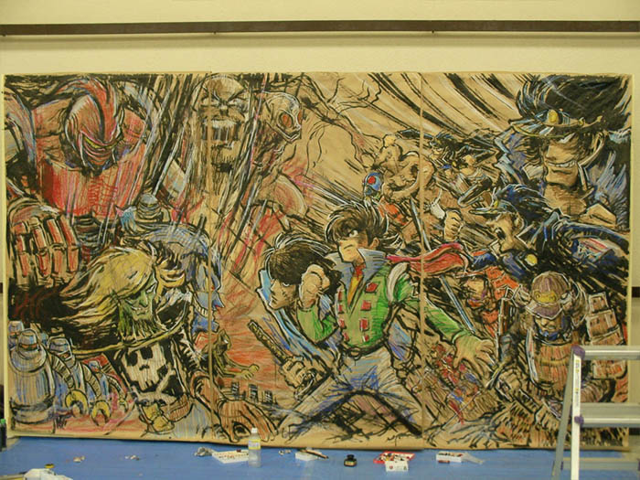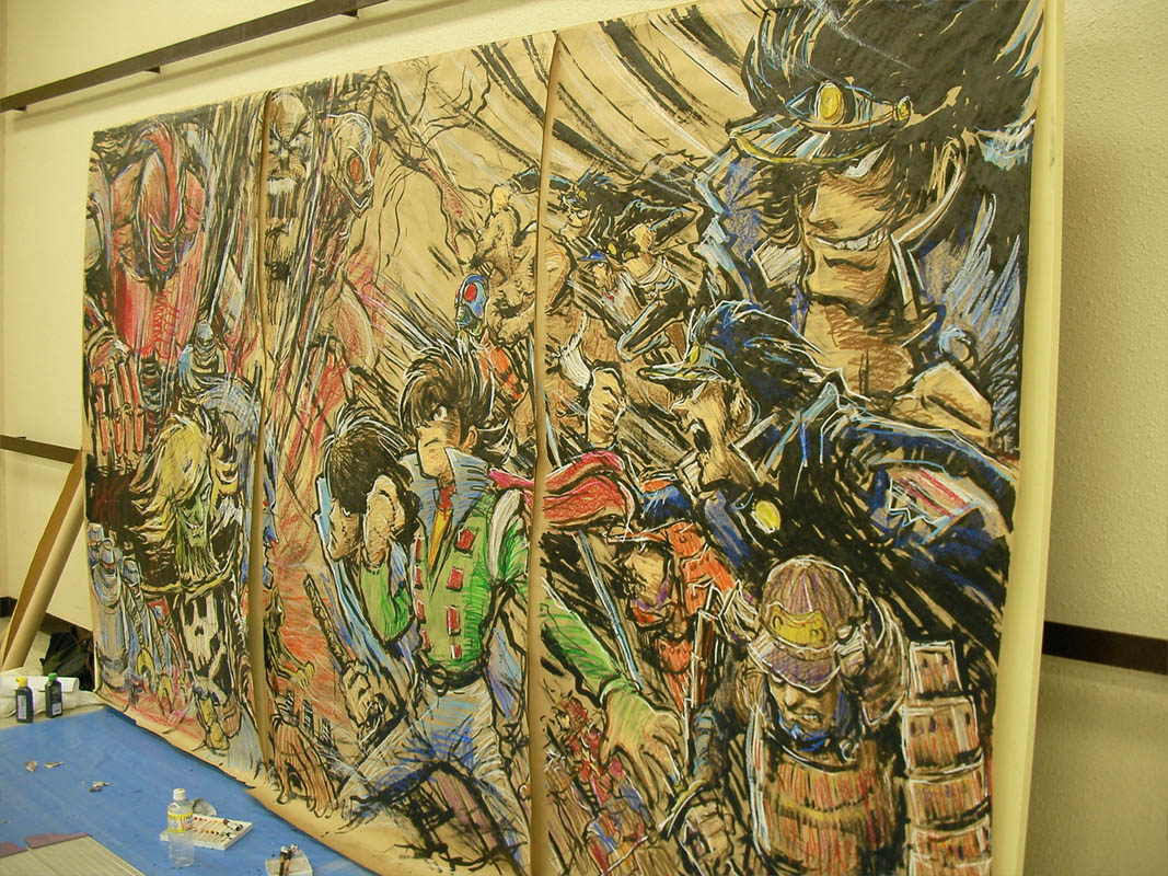うわ!これは恥ずかしい。そんなに大々的に告知される程のものではありませんよ。 いつもの記憶ラクガキに比べて、タテが小さめで横が長くて描きにくいなぁ、と考えながら でも先の事は深く考えずに描き始める。 午前10時半。告知よりも30分ほどフライングである。 石巻のヒーロー「シージェッター海斗」はやはり大きく描かねばなるまい。 時々後ろを振り向くと、見物客がたくさんで驚いたり、 しばらく経って振り向いた時には誰もいなくて寂しかったり。 お子さんの声援に応えたり、お客さんと無駄話をしたりしながら描き進める。 TVやラジオの取材も受けたが、何かテキトーな事を喋っていたような。 このへんで昼食休み。 なぜかサイン会らしき事もする。 午後の開始である。 ショーが終わった「シージェッター海斗」が来てくれた。固く握手を交わす。 「石巻の平和をよろしくお願いします!」と言うと、力強くうなずいてくれた。 午後2時よりワークショップが開催される。参加者は大人2人。 「では皆さん、この絵を手伝って下さい!何の石ノ森キャラクターが描きたいですか!?」と尋ね、 こちらの描いたアタリに沿って描いていただく。 他の人が描いてくれたものに細部を描き足したり足さなかったりして、全体のタッチをそろえて、完成。 閉館間際には、もう見物客はいませんでしたよ。 関東から一緒に来てくれた友人達、地元の友人や大恩人と記念撮影。 この絵はその後、石ノ森萬画館1階に展示されているという。 後まで残るのだったら、うろ憶えで描いたりしないで、もっと丁寧に仕上げるべきだったかもなぁ。 でもゆっくり描いていたら、途中を見てくれていたお客様達が退屈するだろうから、これでヨシとしましょう。 今回のイベントに骨折って下さった皆様、心より感謝しております。 PR |