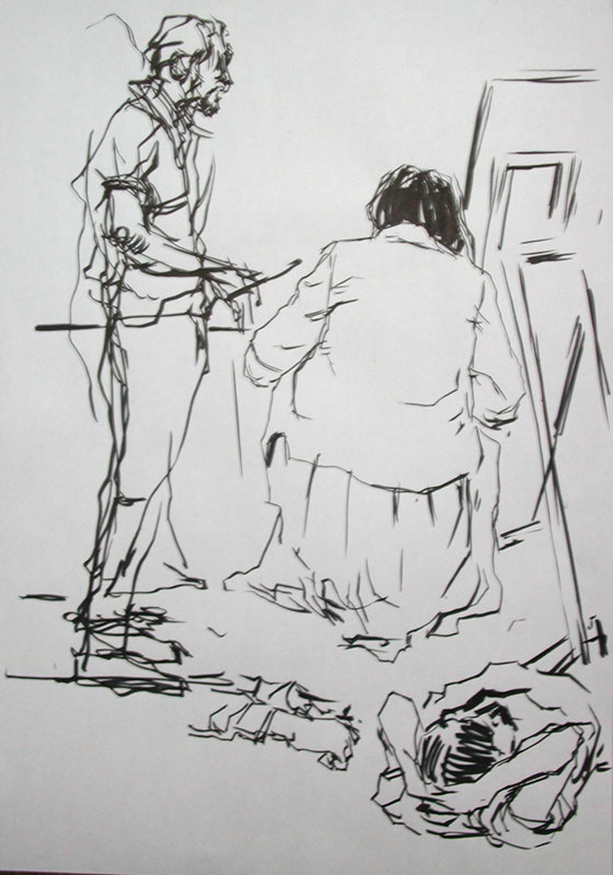 そしてお褒めに預かり光栄であります。 はじめの4枚はA4サイズ、無地のノートで、 それ以外はA3の上質紙(コピー用紙)です。 使用画材は筆ペンです。 以前は日本画用の削用筆と墨汁だったのですが、 最近は楽な方に流れて行き ぺんてるの筆ペン(インク交換ができる奴)を使ったり、 さらに今年になってからは、ダイソーの100円筆ペン(筆先がスポンジの、使い捨てのです)を使う事が多くなってきました。 この辺は練習と割り切って、作品の耐久性など考えずに、持ち歩きが楽で安価な物を使うのがいいのかもと思っております。