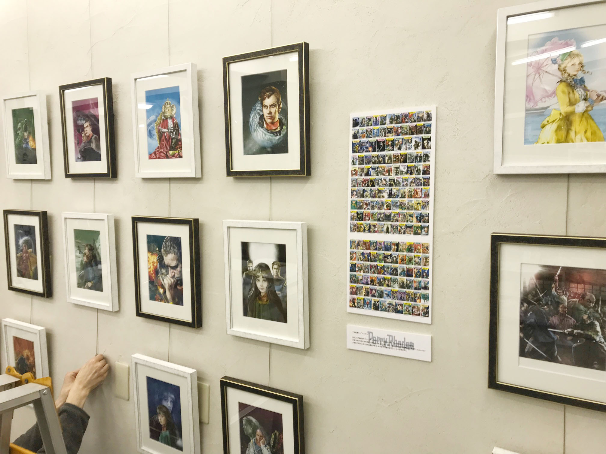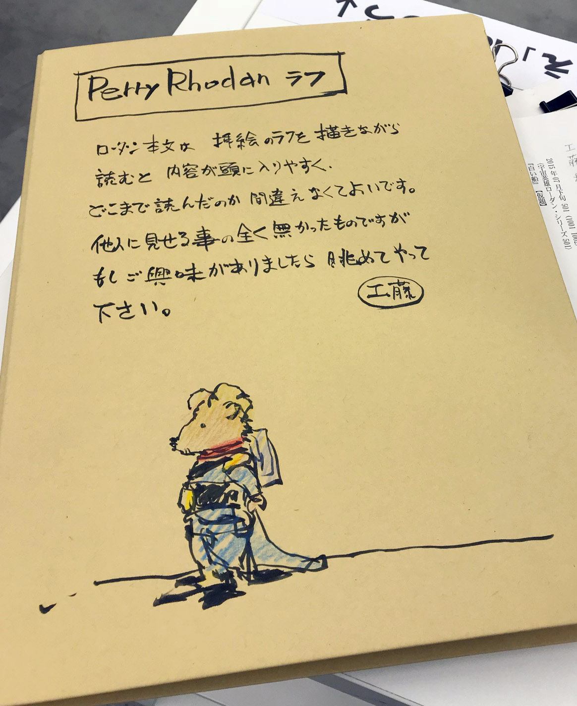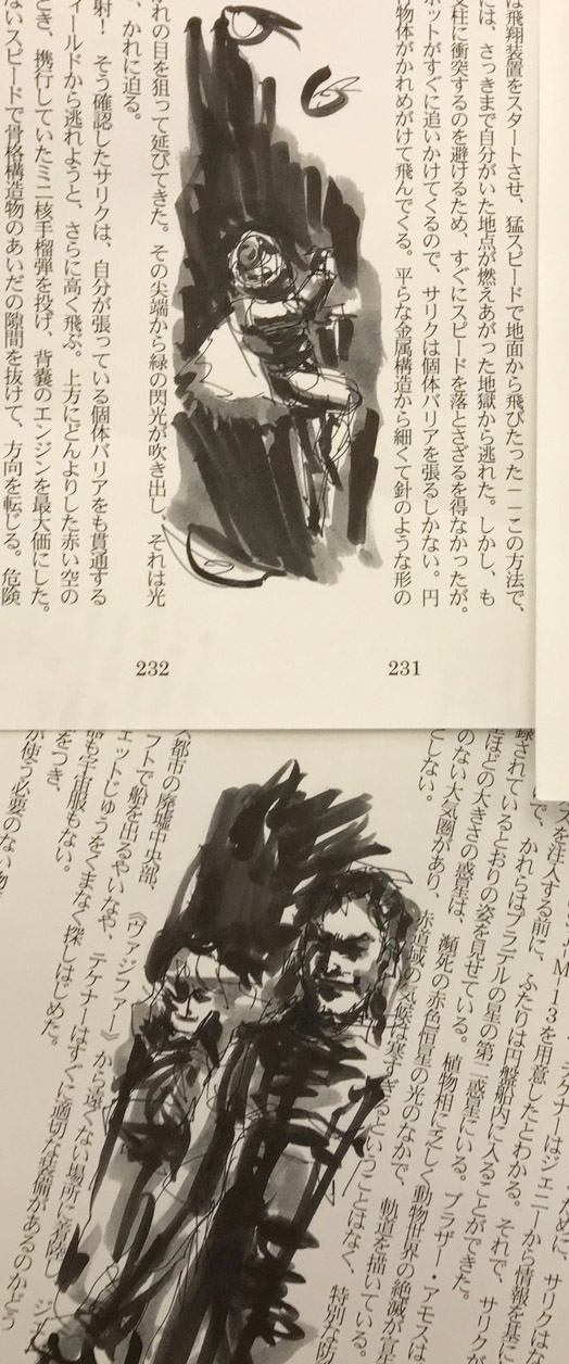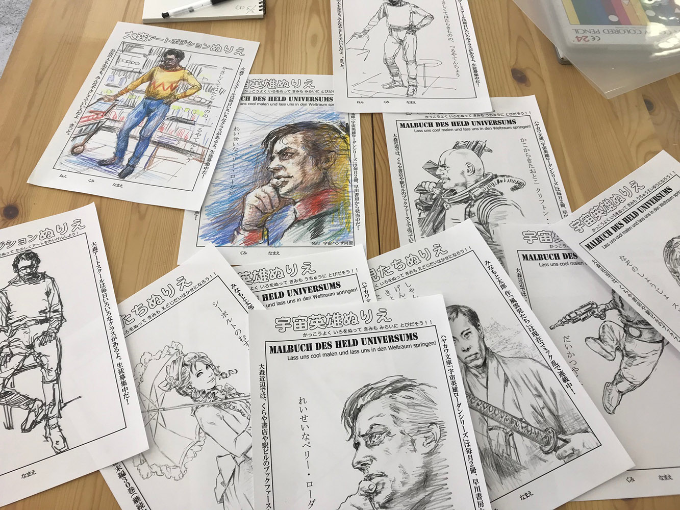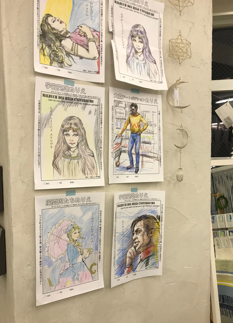 壁に展示している絵以外にも、いくつか置いてあります。 ぬりえ ローダンぬりえ、風雲児ぬりえ等を作ってみました。 もともとアートスクールの児童クラスの子たちに向けて作ったのですが ご希望の方がおられましたら塗っちゃって結構です。 色鉛筆も置いてありますので、好きなだけ塗って下さい。 塗った後は壁に貼って下さると嬉しいです。 ローダンイラストラフ 本文を読みながらメモ代わりに描いた絵がたまってしまいました。 もともと他人様に見せるつもりで描いたものではなく、 展示する程のものでもないので、束ねて机の上に置いてあります。 気になった方は手に取ってながめてやって下さい。 そんな感じで25日までやっています。