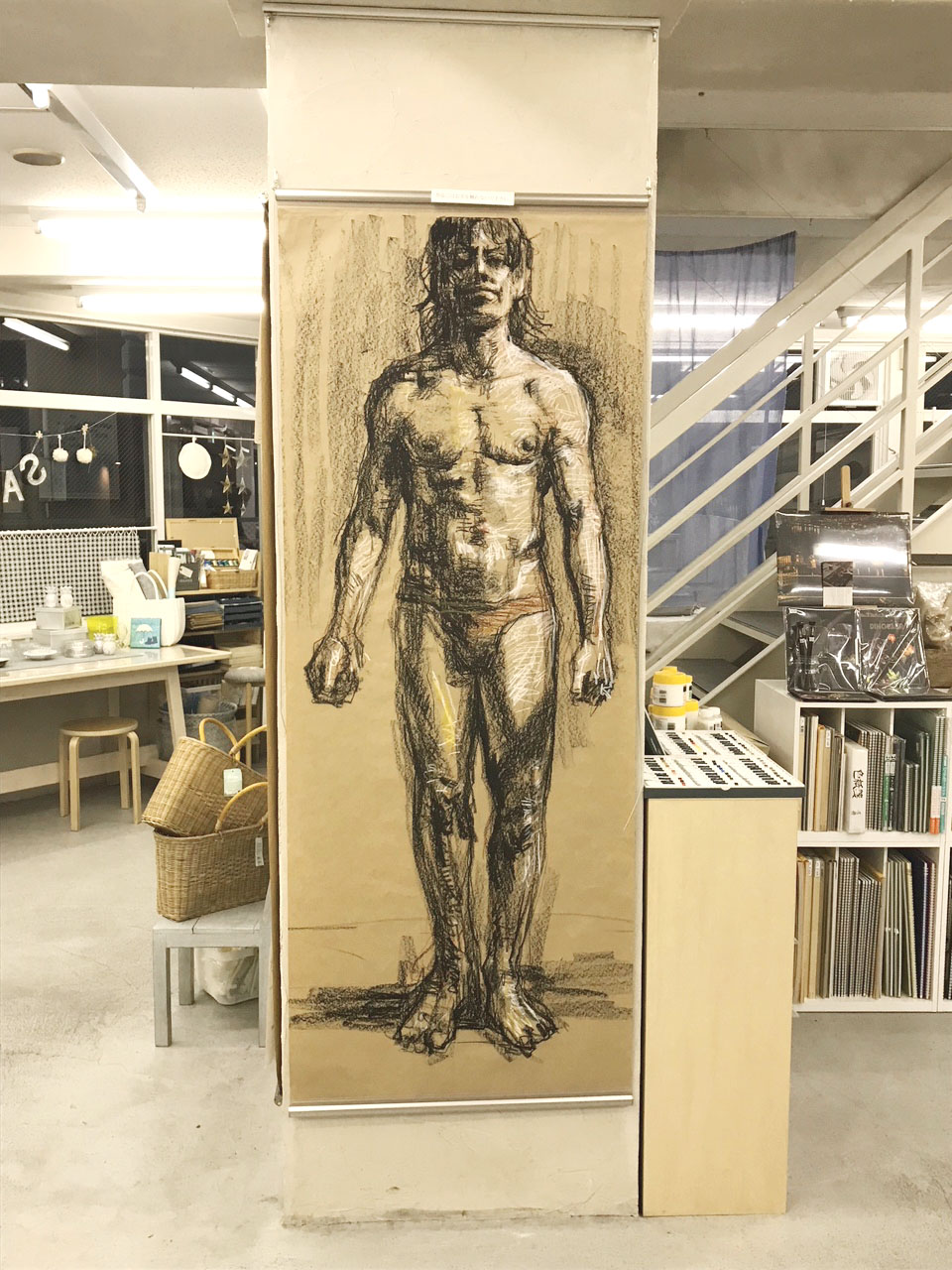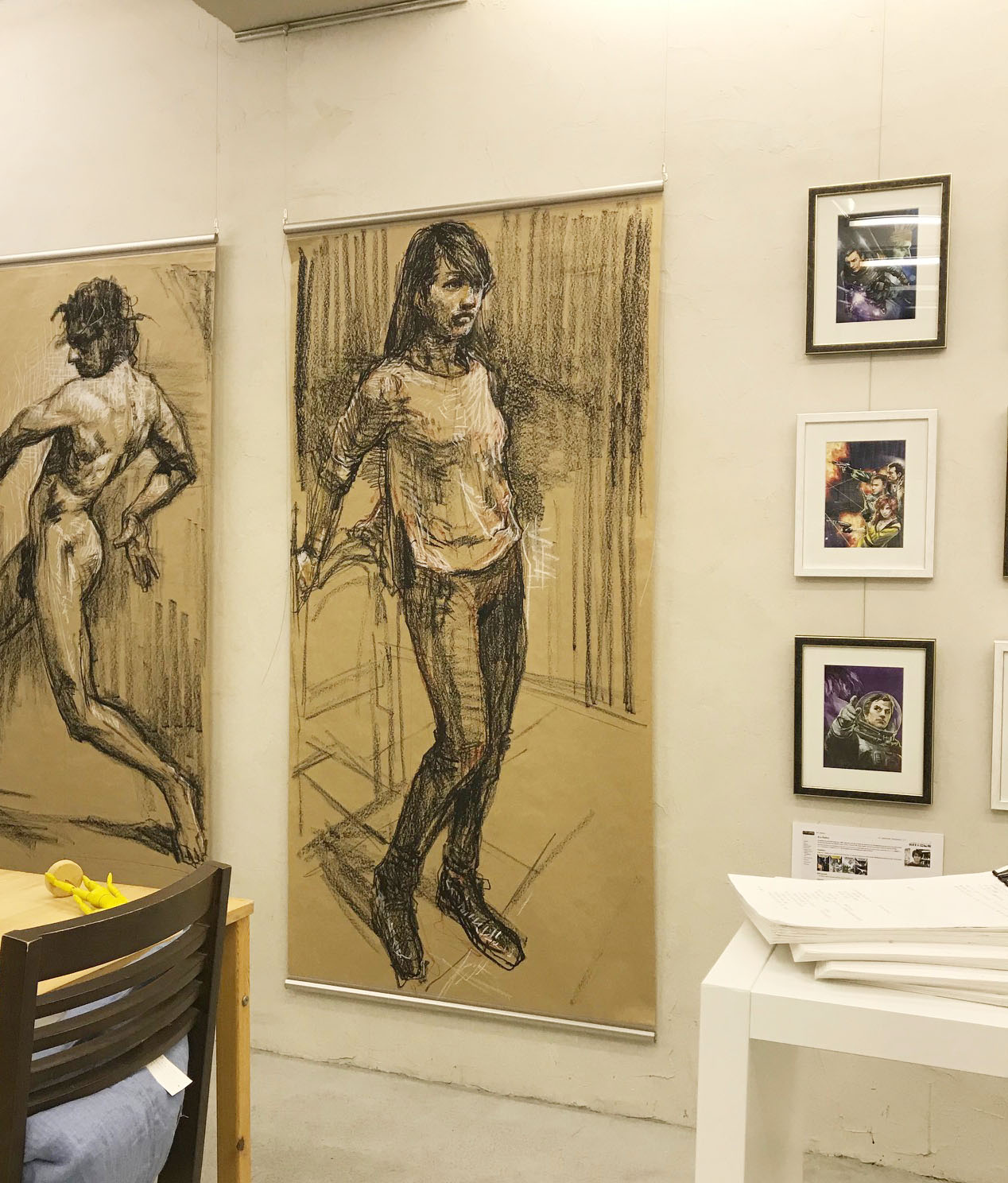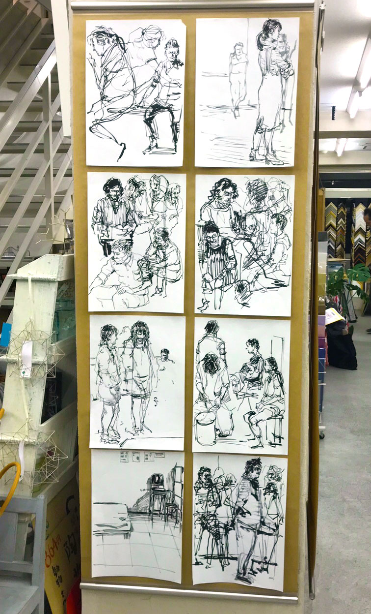 もっと簡単に終わると思っていたのですが、けっこう手間と時間がかかりました。 この入口を入ってすぐに 「風雲児たち」イラストと、簡単な作品紹介が飾ってあります。 その隣りに「宇宙英雄ローダン・シリーズ」イラスト。 その奥には突然でかいドローイング。 これは木曜日の絵画教室で描いた等身大クロッキーと、肩ならしの練習で描いたものです。 それからいつものように、クロッキーやら水彩やら。 枚数はこの何倍も準備していたのですが、壁が一杯になってしまったのでこれ以上貼るのは諦めました。 入口近くの柱には、視界に入った人を勝手に、まるで盗撮のように描いてしまったものを張りました。 今回の展示は「大森アートフェスタ2018」の一環で開催されるものでもあり、また この会場のアートスクール、とくに僕が担当している木曜日の人体クラスの宣伝でもあるのです。 こういう先生がこんなクラスでこんな事をやっていますよという事を近隣の人に伝えるためのものなので、こういう内容の展示になりました。 ジュニアクラスの子供たちが大勢来るし、ドアも壁もほぼガラス張りで外からよく見えるので ヌード絵は控えめにしてみました。 でも肩の練習で描いたこれを、外からよく見えるところに貼ろうとしたのですが 店長が困ったような顔をされたので、柱の反対側に貼る事にしました。 壁面に展示したものはこれで全部です。 これ以外の細かいものは、また明日にでも報告します。 会場 大森アートポジション 〒143-0016 東京都大田区大森北1-37-4 スカイビル1階 https://oomori-art-position.jimdo.com/ 会期 2018年3月3日(土)〜25日(日) 営業時間 AM 10:00~PM 7:00 火曜定休