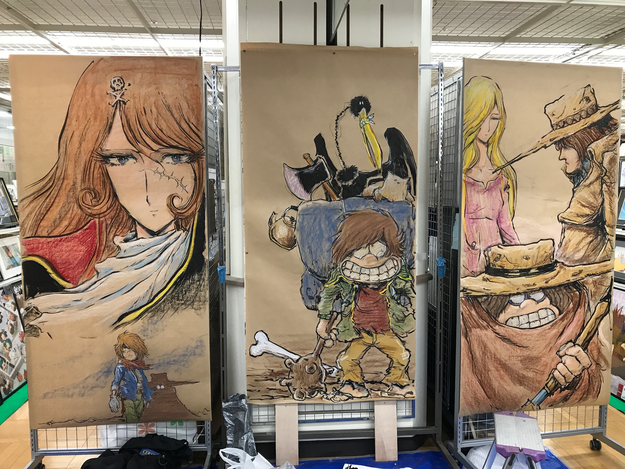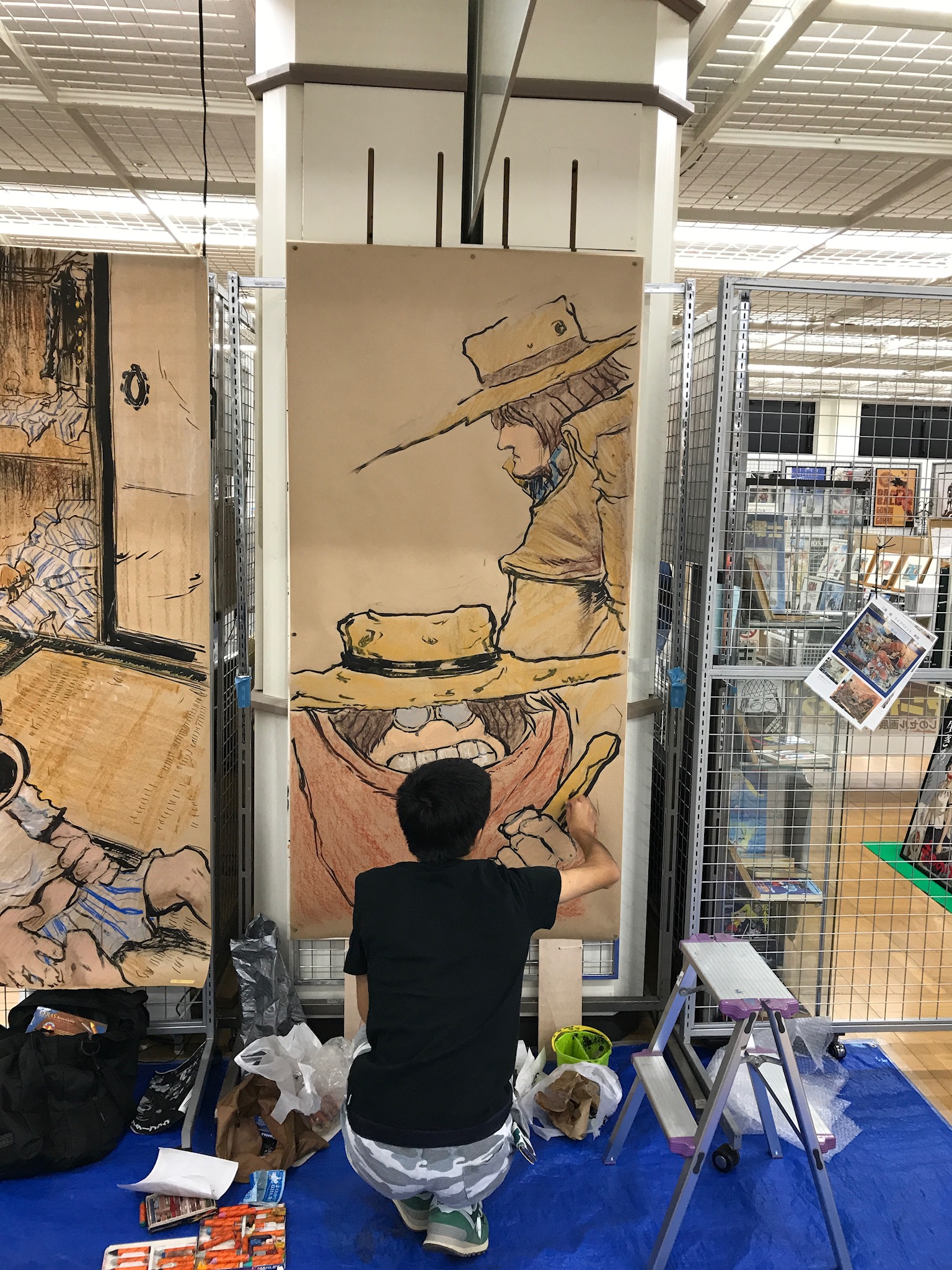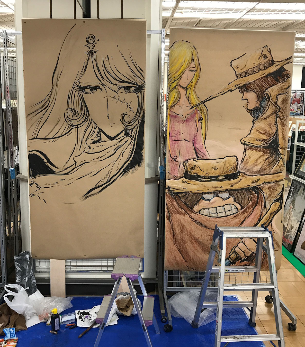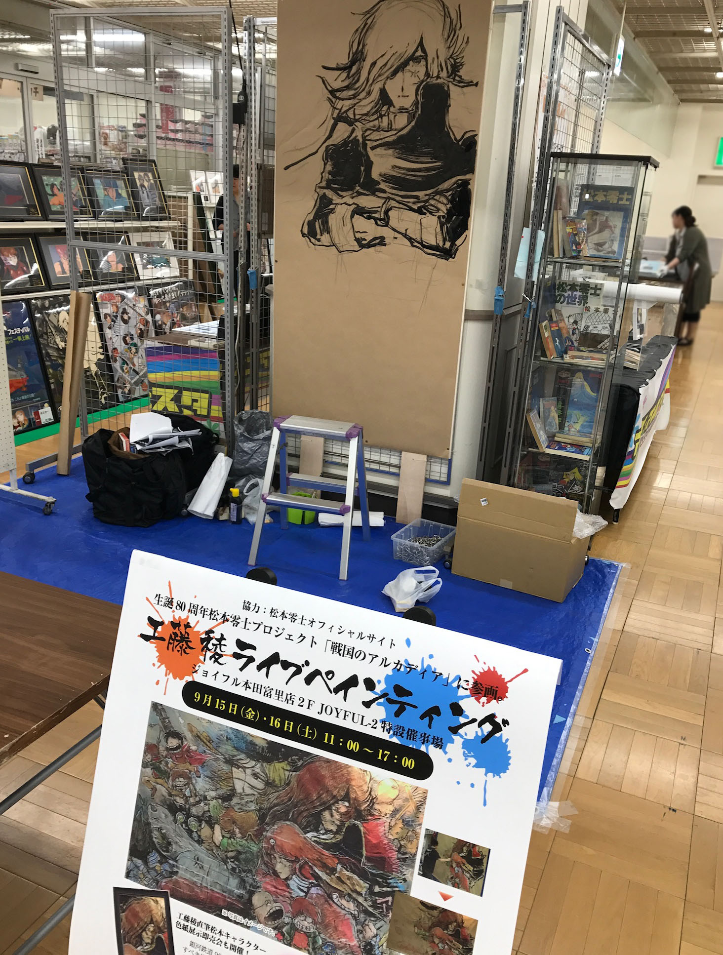 彼は以前、僕の絵のジクレー(注 版画みたいなもの)を売り出そうとサンプルまで作ってくれた事があるが、残念ながら形にはならなかった。今回のライブは再度企画を立てるためのデモンストレーションなのだろうと思っている。 「交通費と宿泊費は出せるがすまない、工藤に支払うギャラが無いのだ」 「そうか。」 「工藤に色紙を描いて貰って、それの売上げで君のギャラにしたい」 「わかった」 というわけで前もって描いたのが以下の十数枚だ。 売れるかどうかは別にして、それを飾っていたら絵が出来上がる前の賑やかしになるし、自分の練習にもなる。キャラクターの版権的には、松本零士公式サイトさんの御協力をいただいた。 そして2日目。 昨日の店員さんが、高校一年の息子さんに見せたいと、休暇の日だというのに来てくれた。 息子は美術部だというので、彩色を手伝ってくれるようお願いしてみた。 上手かったので、細部の描き込みもいくつかお願いした。僕は少し休む事が出来た。 ありがとう。 館内放送では十数分おきに、僕が描いている事を紹介してくれていた。 ときどきT原君がマイクを持ちながらすぐ後ろで実況放送をしていた。 「工藤がたった今描き終わったのは、ガンフロンティアのトチロー、ハーロック、シヌノラの三人です。工藤はこのガンフロンティアの文庫本の装丁画を担当しております。次の絵に取りかかりました。何を描いてくれるのでしょう。そろそろメジャーなキャラクターを描いてほしいところです。」 有名キャラか。では、ということでエメラルダスに取りかかる。 途中で昼食をとり、本日最後の1枚を描きはじめた。 絵としてまとめる事など考えず、適当に自分が楽しめる物にしよう。 大山一族勢揃いなんて楽しそうだ。 大山だけではなく足立、山本、井台もいるだろう。似たような顔ばかりでいいぞ。 と考えていたが、気がついたらワダチになっていた。 ワダチは面白いからなぁ。仕方ないな。 というところで時間になり修了。 とくに余韻はなく、片付けて帰ったのだった。 企画してくれたT原君、 ジョイフル本田の皆様、 観に来て下さった皆様、励まして下さった皆様、 そして購入などとという物凄い事をして下さった皆様、 ありがとうございます。 感謝の言葉もありません。 描いた絵や残った色紙は、このあとジョイフル本田富里店2Fの催事場あたりにしばらく飾ってくれるそうです。ありがたい事です。 9月15〜16日、ジョイフル本田、千葉の富里店で絵を描いてきた。 公式の協力をいただいて、陽の当たるところで堂々と松本キャラを描いてきたのだ。 (練馬の盆踊りも許可はいただいて明るいところで堂々と描いてはいますが。) 自宅から電車で2時間、そこから車で十数分、自分が一体何処にいるのかまったくわからないまま描きはじめた。 1枚畳大のサイズ。前もってこの3倍のサイズが描きたいとお願いしていた(それでも遠慮したサイズだ)が、直前になってこのサイズしか場所が準備出来ないと言う連絡があって困っていた。 さらに「大きな紙が無い」との事で、しかたないのでロール紙を探して買っておいたのだが、前日になって先方が「準備した」という話になり、連絡をこまめに確認し合う事の重要性を強く感じたのであった。 広報のレジにいた店員さんが「時々顔を上げると、どんどん変わっている。見ていると凄い早さで描き上がって行く。感激した」と言って下さった。 「これが見られるなんて、この仕事に入って今日ほどよかったと思ったことがない」と過分なお褒めのことばをいただいた。 いつものように無計画に描き進める。 通りかかったお客さんが励ましの声をかけて下さる。 今日の最後は、自分へのサービスで男おいどんを描く。 したから描いて行ったので、膝枕の女性を描こうと思ったのは途中からだ。 この女性は誰だろう。清水さんでも浅野さんでもないし、でも下宿にこんな人がいたような。 twitterで「西尾さん…」というコメントがついたので、何となくそんな気がする。 というところで1日目修了しました。 この地での作業は2日目に続くのだ。 |