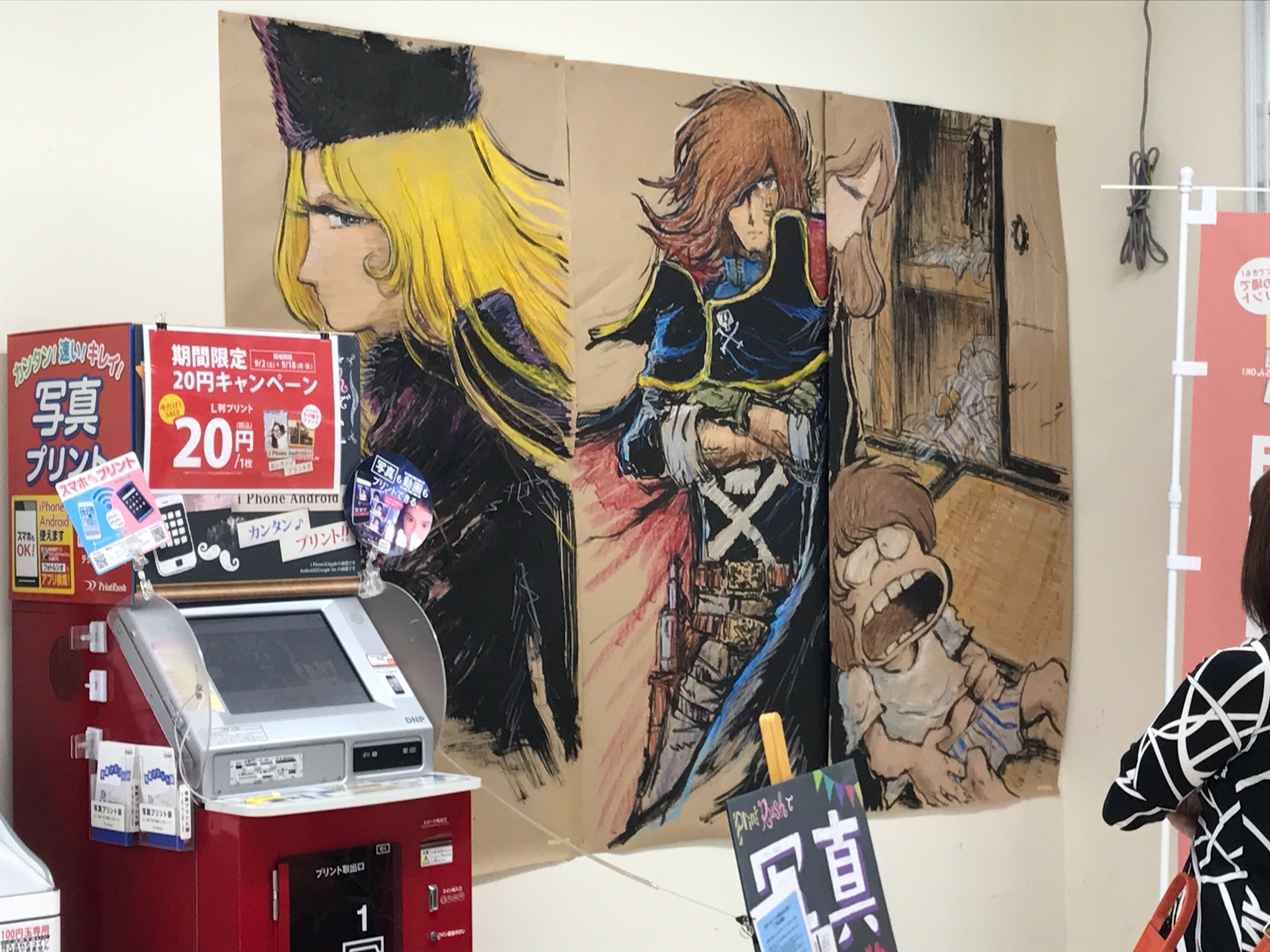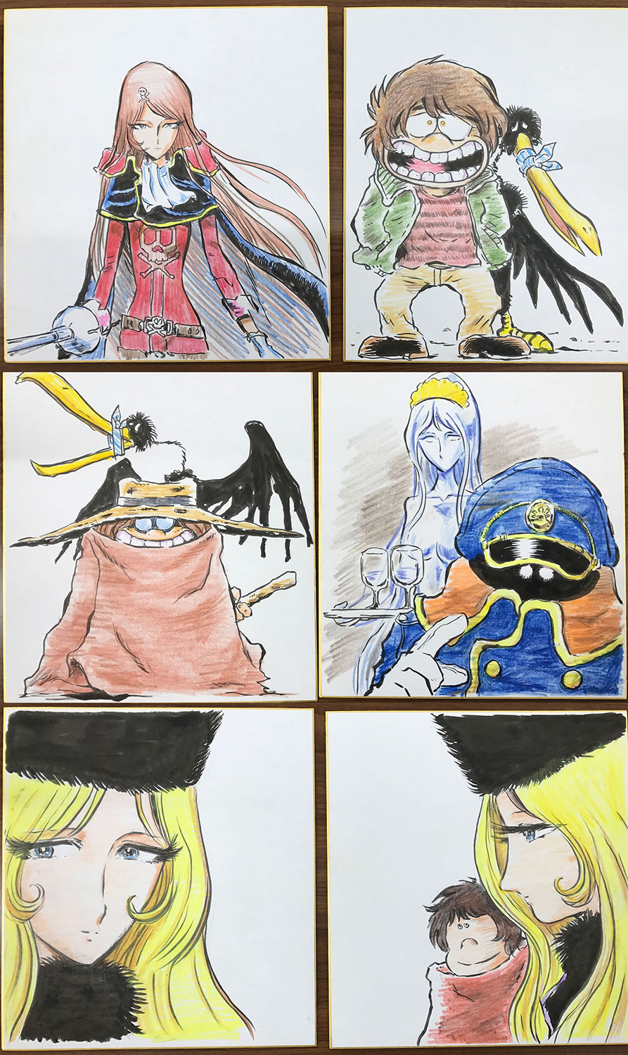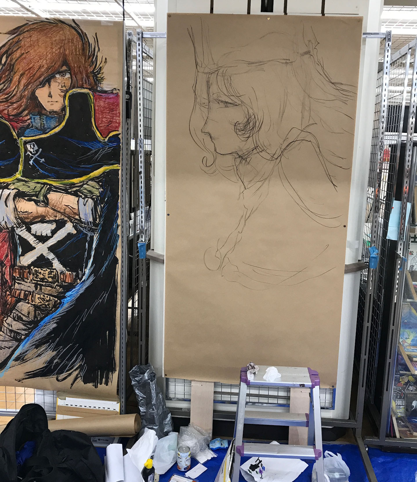 彼は以前、僕の絵のジクレー(注 版画みたいなもの)を売り出そうとサンプルまで作ってくれた事があるが、残念ながら形にはならなかった。今回のライブは再度企画を立てるためのデモンストレーションなのだろうと思っている。 「交通費と宿泊費は出せるがすまない、工藤に支払うギャラが無いのだ」 「そうか。」 「工藤に色紙を描いて貰って、それの売上げで君のギャラにしたい」 「わかった」 というわけで前もって描いたのが以下の十数枚だ。 売れるかどうかは別にして、それを飾っていたら絵が出来上がる前の賑やかしになるし、自分の練習にもなる。キャラクターの版権的には、松本零士公式サイトさんの御協力をいただいた。 そして2日目。 昨日の店員さんが、高校一年の息子さんに見せたいと、休暇の日だというのに来てくれた。 息子は美術部だというので、彩色を手伝ってくれるようお願いしてみた。 上手かったので、細部の描き込みもいくつかお願いした。僕は少し休む事が出来た。 ありがとう。 館内放送では十数分おきに、僕が描いている事を紹介してくれていた。 ときどきT原君がマイクを持ちながらすぐ後ろで実況放送をしていた。 「工藤がたった今描き終わったのは、ガンフロンティアのトチロー、ハーロック、シヌノラの三人です。工藤はこのガンフロンティアの文庫本の装丁画を担当しております。次の絵に取りかかりました。何を描いてくれるのでしょう。そろそろメジャーなキャラクターを描いてほしいところです。」 有名キャラか。では、ということでエメラルダスに取りかかる。 途中で昼食をとり、本日最後の1枚を描きはじめた。 絵としてまとめる事など考えず、適当に自分が楽しめる物にしよう。 大山一族勢揃いなんて楽しそうだ。 大山だけではなく足立、山本、井台もいるだろう。似たような顔ばかりでいいぞ。 と考えていたが、気がついたらワダチになっていた。 ワダチは面白いからなぁ。仕方ないな。 というところで時間になり修了。 とくに余韻はなく、片付けて帰ったのだった。 企画してくれたT原君、 ジョイフル本田の皆様、 観に来て下さった皆様、励まして下さった皆様、 そして購入などとという物凄い事をして下さった皆様、 ありがとうございます。 感謝の言葉もありません。 描いた絵や残った色紙は、このあとジョイフル本田富里店2Fの催事場あたりにしばらく飾ってくれるそうです。ありがたい事です。 9月15〜16日、ジョイフル本田、千葉の富里店で絵を描いてきた。 公式の協力をいただいて、陽の当たるところで堂々と松本キャラを描いてきたのだ。 (練馬の盆踊りも許可はいただいて明るいところで堂々と描いてはいますが。) 自宅から電車で2時間、そこから車で十数分、自分が一体何処にいるのかまったくわからないまま描きはじめた。 1枚畳大のサイズ。前もってこの3倍のサイズが描きたいとお願いしていた(それでも遠慮したサイズだ)が、直前になってこのサイズしか場所が準備出来ないと言う連絡があって困っていた。 さらに「大きな紙が無い」との事で、しかたないのでロール紙を探して買っておいたのだが、前日になって先方が「準備した」という話になり、連絡をこまめに確認し合う事の重要性を強く感じたのであった。 広報のレジにいた店員さんが「時々顔を上げると、どんどん変わっている。見ていると凄い早さで描き上がって行く。感激した」と言って下さった。 「これが見られるなんて、この仕事に入って今日ほどよかったと思ったことがない」と過分なお褒めのことばをいただいた。 いつものように無計画に描き進める。 通りかかったお客さんが励ましの声をかけて下さる。 今日の最後は、自分へのサービスで男おいどんを描く。 したから描いて行ったので、膝枕の女性を描こうと思ったのは途中からだ。 この女性は誰だろう。清水さんでも浅野さんでもないし、でも下宿にこんな人がいたような。 twitterで「西尾さん…」というコメントがついたので、何となくそんな気がする。 というところで1日目修了しました。 この地での作業は2日目に続くのだ。 |