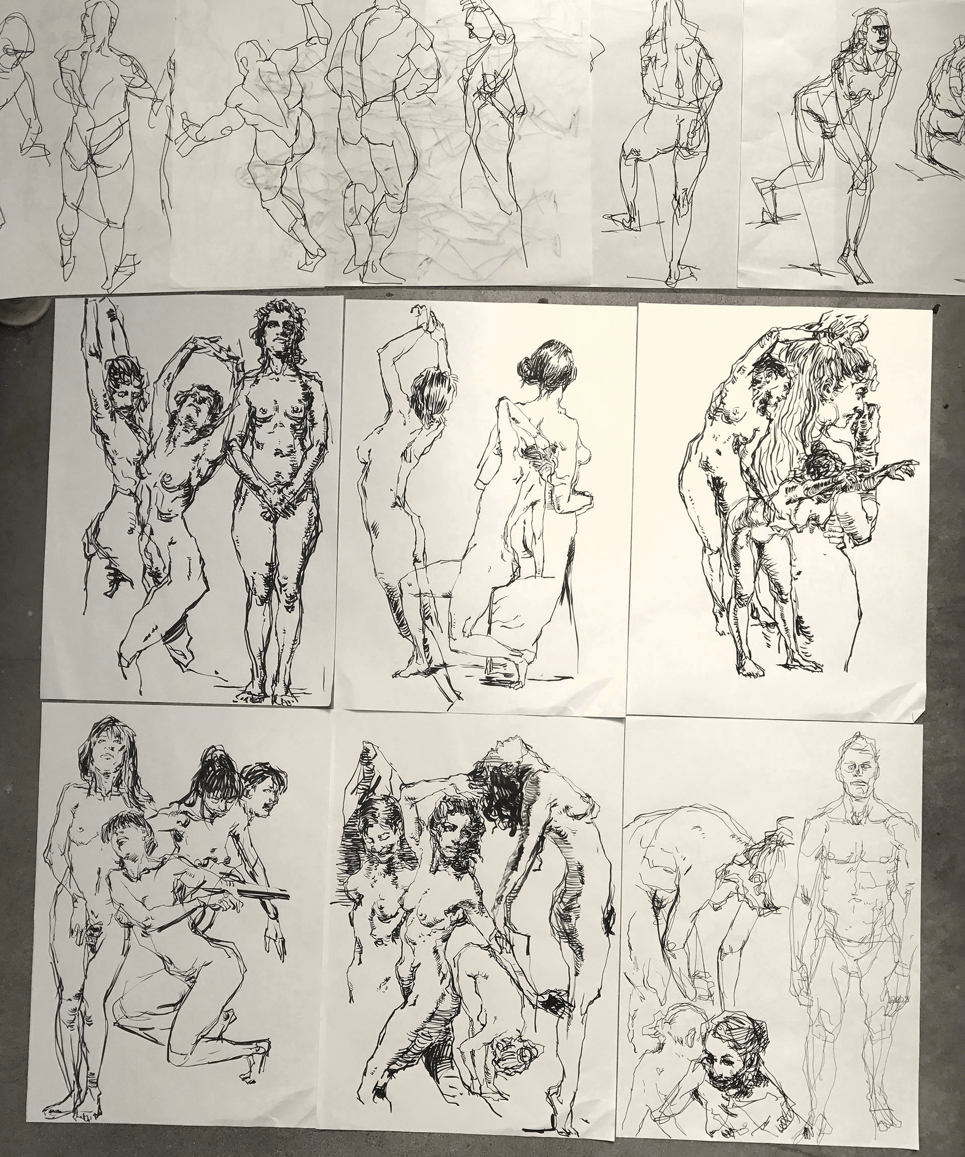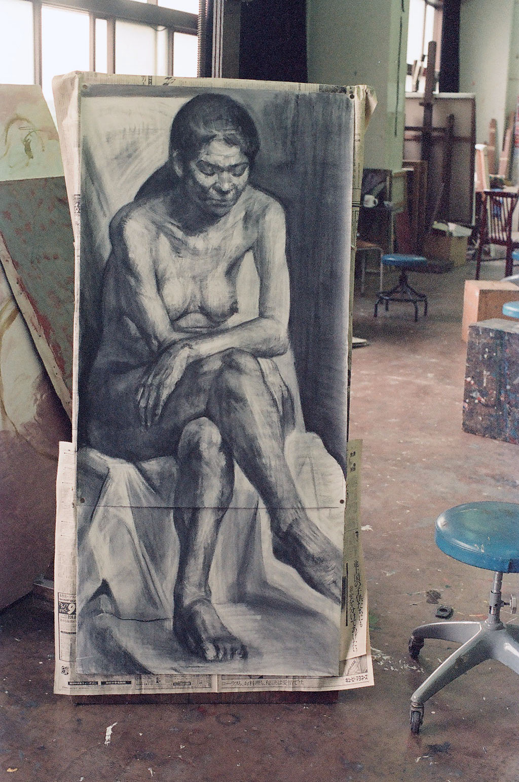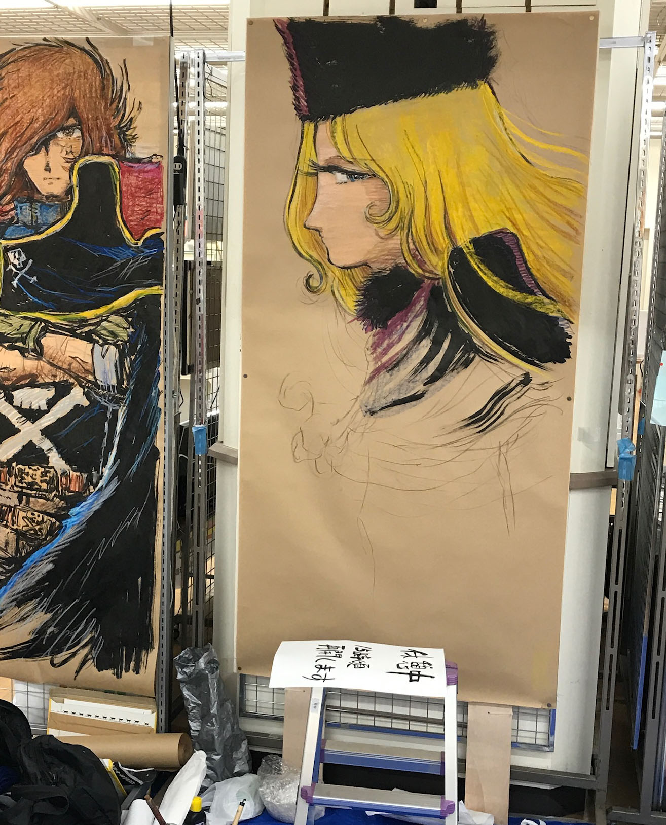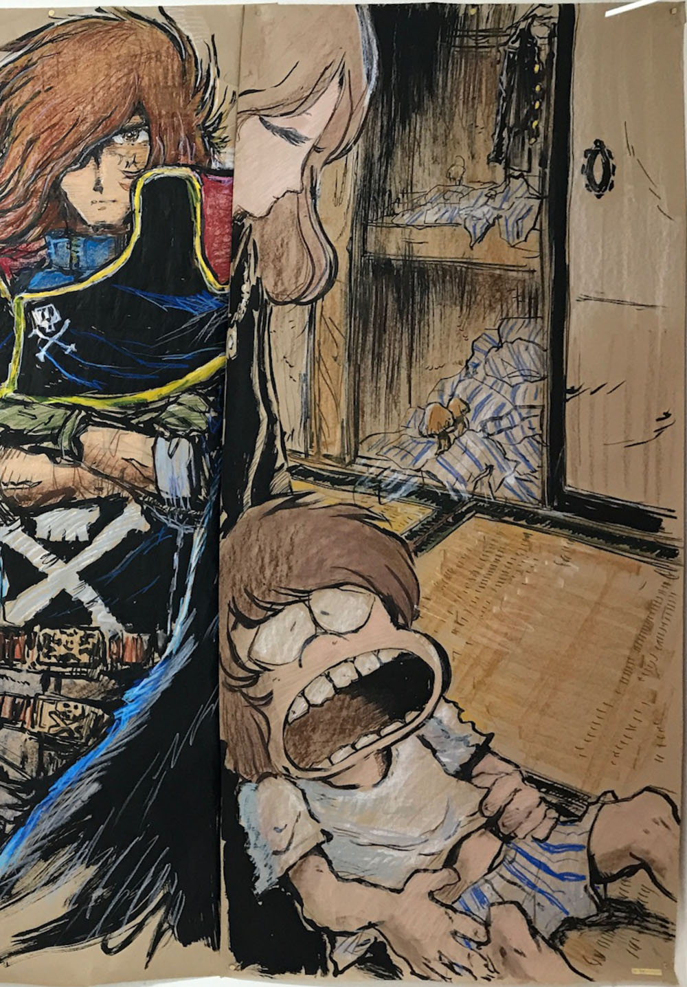 彼は以前、僕の絵のジクレー(注 版画みたいなもの)を売り出そうとサンプルまで作ってくれた事があるが、残念ながら形にはならなかった。今回のライブは再度企画を立てるためのデモンストレーションなのだろうと思っている。 「交通費と宿泊費は出せるがすまない、工藤に支払うギャラが無いのだ」 「そうか。」 「工藤に色紙を描いて貰って、それの売上げで君のギャラにしたい」 「わかった」 というわけで前もって描いたのが以下の十数枚だ。 売れるかどうかは別にして、それを飾っていたら絵が出来上がる前の賑やかしになるし、自分の練習にもなる。キャラクターの版権的には、松本零士公式サイトさんの御協力をいただいた。 そして2日目。 昨日の店員さんが、高校一年の息子さんに見せたいと、休暇の日だというのに来てくれた。 息子は美術部だというので、彩色を手伝ってくれるようお願いしてみた。 上手かったので、細部の描き込みもいくつかお願いした。僕は少し休む事が出来た。 ありがとう。 館内放送では十数分おきに、僕が描いている事を紹介してくれていた。 ときどきT原君がマイクを持ちながらすぐ後ろで実況放送をしていた。 「工藤がたった今描き終わったのは、ガンフロンティアのトチロー、ハーロック、シヌノラの三人です。工藤はこのガンフロンティアの文庫本の装丁画を担当しております。次の絵に取りかかりました。何を描いてくれるのでしょう。そろそろメジャーなキャラクターを描いてほしいところです。」 有名キャラか。では、ということでエメラルダスに取りかかる。 途中で昼食をとり、本日最後の1枚を描きはじめた。 絵としてまとめる事など考えず、適当に自分が楽しめる物にしよう。 大山一族勢揃いなんて楽しそうだ。 大山だけではなく足立、山本、井台もいるだろう。似たような顔ばかりでいいぞ。 と考えていたが、気がついたらワダチになっていた。 ワダチは面白いからなぁ。仕方ないな。 というところで時間になり修了。 とくに余韻はなく、片付けて帰ったのだった。 企画してくれたT原君、 ジョイフル本田の皆様、 観に来て下さった皆様、励まして下さった皆様、 そして購入などとという物凄い事をして下さった皆様、 ありがとうございます。 感謝の言葉もありません。 描いた絵や残った色紙は、このあとジョイフル本田富里店2Fの催事場あたりにしばらく飾ってくれるそうです。ありがたい事です。 9月15〜16日、ジョイフル本田、千葉の富里店で絵を描いてきた。 公式の協力をいただいて、陽の当たるところで堂々と松本キャラを描いてきたのだ。 (練馬の盆踊りも許可はいただいて明るいところで堂々と描いてはいますが。) 自宅から電車で2時間、そこから車で十数分、自分が一体何処にいるのかまったくわからないまま描きはじめた。 1枚畳大のサイズ。前もってこの3倍のサイズが描きたいとお願いしていた(それでも遠慮したサイズだ)が、直前になってこのサイズしか場所が準備出来ないと言う連絡があって困っていた。 さらに「大きな紙が無い」との事で、しかたないのでロール紙を探して買っておいたのだが、前日になって先方が「準備した」という話になり、連絡をこまめに確認し合う事の重要性を強く感じたのであった。 広報のレジにいた店員さんが「時々顔を上げると、どんどん変わっている。見ていると凄い早さで描き上がって行く。感激した」と言って下さった。 「これが見られるなんて、この仕事に入って今日ほどよかったと思ったことがない」と過分なお褒めのことばをいただいた。 いつものように無計画に描き進める。 通りかかったお客さんが励ましの声をかけて下さる。 今日の最後は、自分へのサービスで男おいどんを描く。 したから描いて行ったので、膝枕の女性を描こうと思ったのは途中からだ。 この女性は誰だろう。清水さんでも浅野さんでもないし、でも下宿にこんな人がいたような。 twitterで「西尾さん…」というコメントがついたので、何となくそんな気がする。 というところで1日目修了しました。 この地での作業は2日目に続くのだ。 |