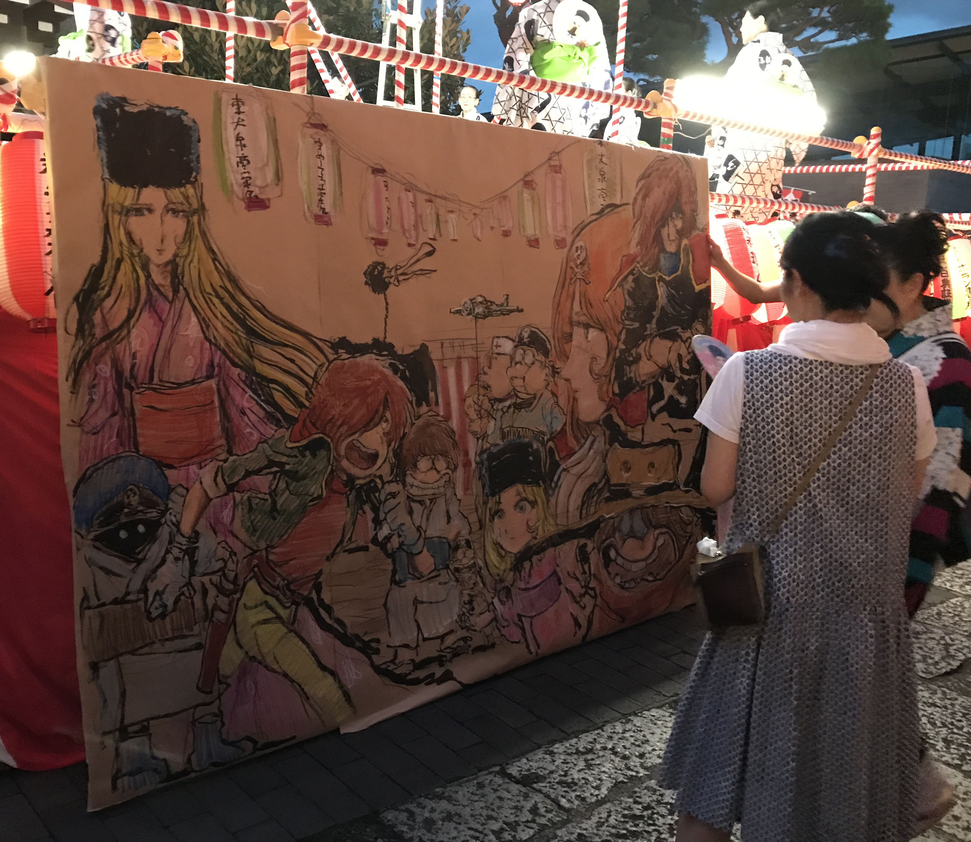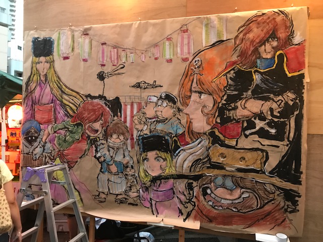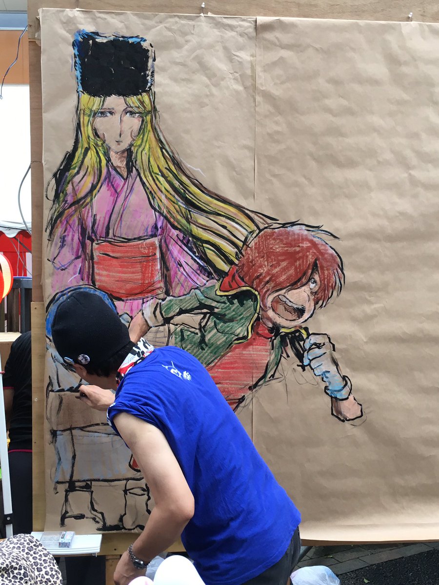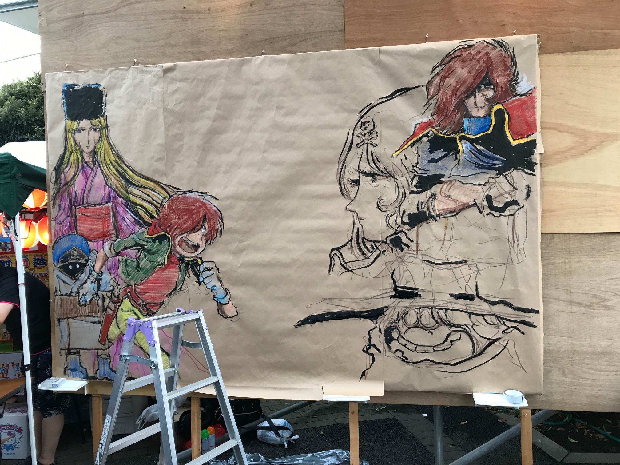 いや大きいと言う程でもないサイズだが。 銀河の夜の盆踊り大会で描いてきた。 暑かったが今回は普通に暑いだけだったのでよかった。 以前(2年前と3年前)は倒れそうな程の暑さと直射日光だったからなぁ。 人がたくさん来る頃には、後ろに下がって構図を考える事が出来なくなるので 16時に開始の予定だったが、30分程早めに描き始める。 「盆踊り風にならないだろうか」という商店街からの希望に応え、メーテルには浴衣を着せてみた。 さてこの後どうすれば良いだろうと、少し考え込む。相変わらず無計画だ。 お客様からの差し入れをいただいたり冷たいお茶を何本も飲んだりヤキソバを食べたりしながら描いて、気がついたら大体できあがった。 このあたりで一昨年のように、パネルが寄付金の札でいっぱいになったので、絵は撤去される事になる。 今回はこの事態を見越し、紙をスタイロホームの土台に貼り、移動できるようにしてあったのだ。 19時前で少し早かったが、予定通りヤグラの下に置かれることになった。 実はまだ完成していないんだが、これ以上手を入れてもそんなに変わらないだろうからこれくらいにしておいた。 その後は絵の回りを囲んで盆踊りが始まり 和太鼓が叩かれたり 絵の上で区議員の人が挨拶したり 歌手の人が歌って、見ていた子供たちが踊ったり また盆踊りが始まったり 自分が描いた絵の周囲でこんな儀式が続く光景はなんだか不思議で面白可笑しいものだった。 今年は松本先生と会えなかったのが残念だ。 1日経った今は筋肉痛なので自宅で安静にしている。 |