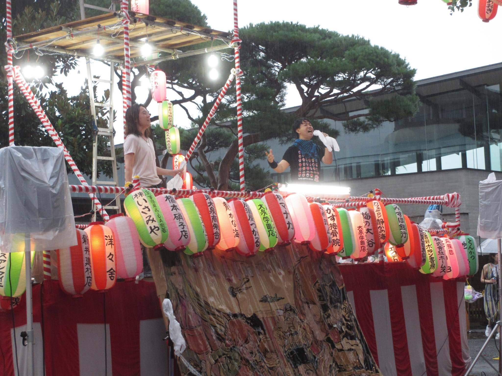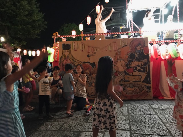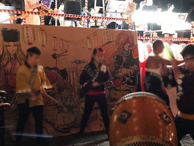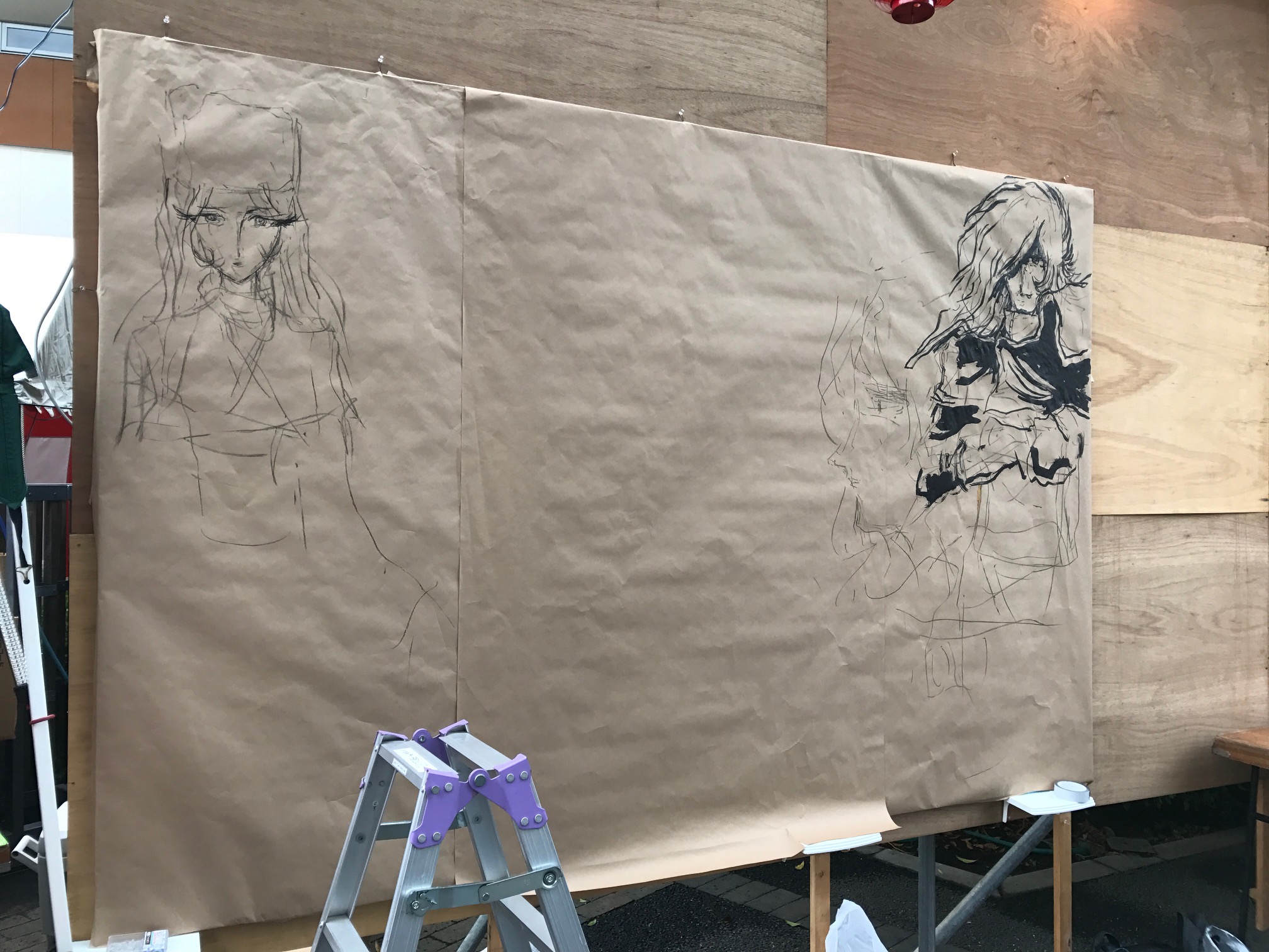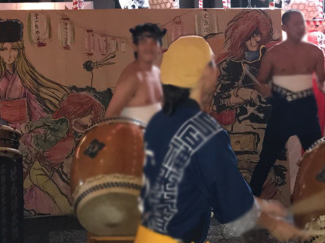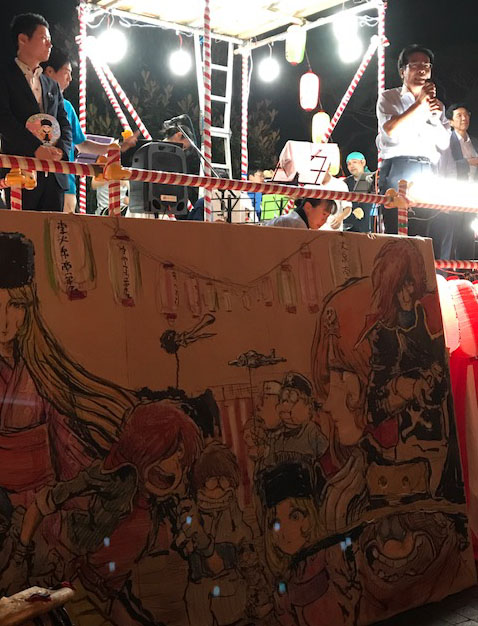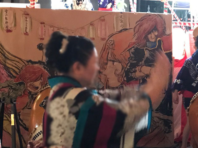 いや大きいと言う程でもないサイズだが。 銀河の夜の盆踊り大会で描いてきた。 暑かったが今回は普通に暑いだけだったのでよかった。 以前(2年前と3年前)は倒れそうな程の暑さと直射日光だったからなぁ。 人がたくさん来る頃には、後ろに下がって構図を考える事が出来なくなるので 16時に開始の予定だったが、30分程早めに描き始める。 「盆踊り風にならないだろうか」という商店街からの希望に応え、メーテルには浴衣を着せてみた。 さてこの後どうすれば良いだろうと、少し考え込む。相変わらず無計画だ。 お客様からの差し入れをいただいたり冷たいお茶を何本も飲んだりヤキソバを食べたりしながら描いて、気がついたら大体できあがった。 このあたりで一昨年のように、パネルが寄付金の札でいっぱいになったので、絵は撤去される事になる。 今回はこの事態を見越し、紙をスタイロホームの土台に貼り、移動できるようにしてあったのだ。 19時前で少し早かったが、予定通りヤグラの下に置かれることになった。 実はまだ完成していないんだが、これ以上手を入れてもそんなに変わらないだろうからこれくらいにしておいた。 その後は絵の回りを囲んで盆踊りが始まり 和太鼓が叩かれたり 絵の上で区議員の人が挨拶したり 歌手の人が歌って、見ていた子供たちが踊ったり また盆踊りが始まったり 自分が描いた絵の周囲でこんな儀式が続く光景はなんだか不思議で面白可笑しいものだった。 今年は松本先生と会えなかったのが残念だ。 1日経った今は筋肉痛なので自宅で安静にしている。 |