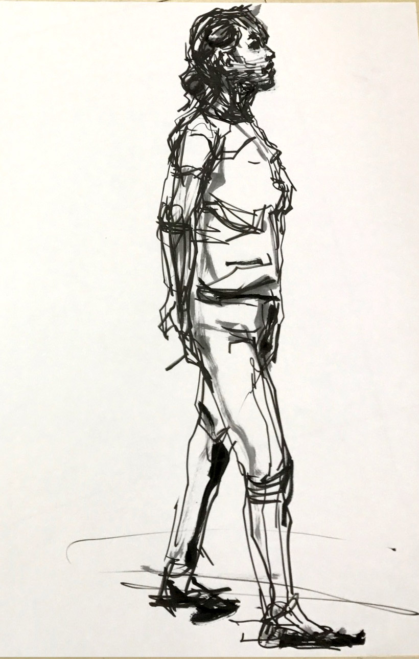 北海道の姉が、使用画材や所要時間も書き添えるのが親切というものだと言っていたので、たまには書いてみます。 今回載せたものは、四つ切り画用紙(382×542mm)に鉛筆。 (粉木炭を水で溶いたものを、薄墨のように筆で使用してアタリを取ったものもあります) 鉛筆は北星鉛筆の3〜5B、またはステッドラーのマルスルモグラフブラック4〜6B かかった時間は大体40〜60分(20分ポーズ2〜3回分) 最後の斜めに座っているやつだけは形が上手くとれなかったので120分 私信) 姉さん……こんなのでどうでしょうか。 [追記] 調子(明暗の描写)は軽い補助程度にして、輪郭線の強弱で立体を捉えようと考えました。 形のとり方を厳し目にした、時間をかけたクロッキーという感じでしょうか。 時間をあまりかけずに、1回(正味120分)で2枚描く事にしたので、紙のサイズはいつもの半分にしました。 私信)コメント欄 佐藤さん、これでどうでしょう…… |