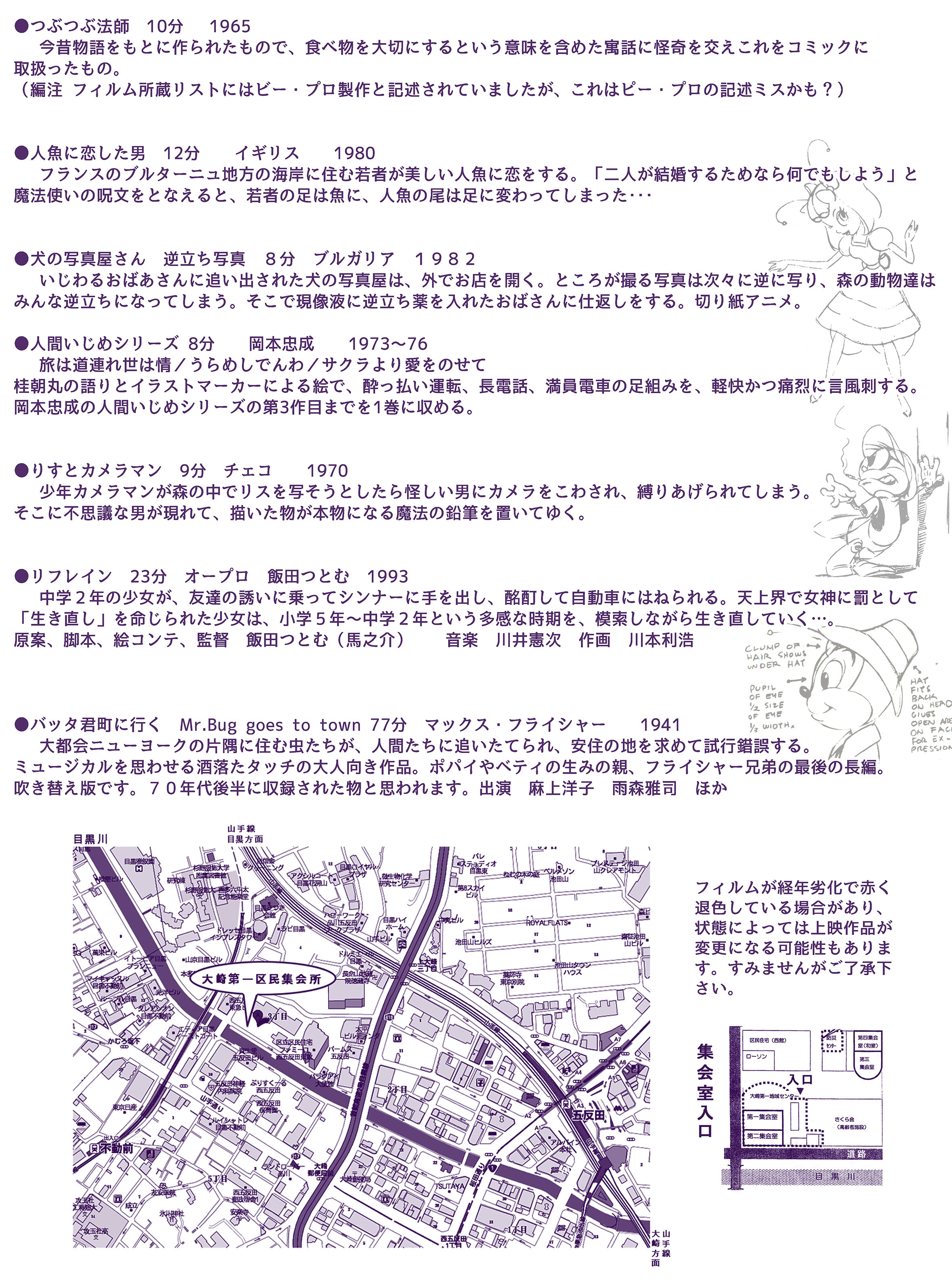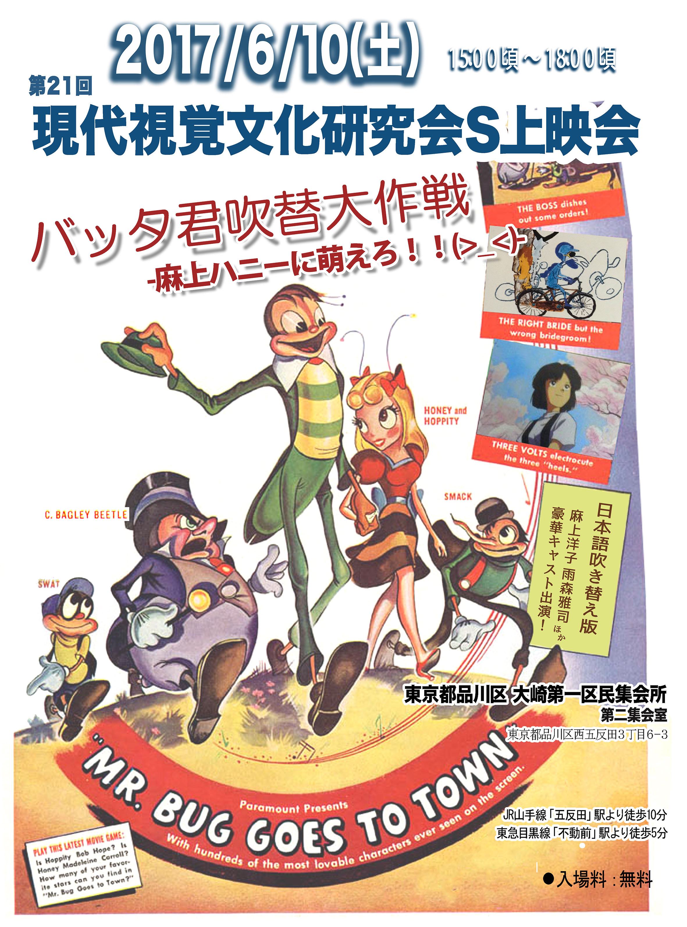 今回はフライシャー兄弟による最後の長編『バッタ君町に行く』を中心に上映致します。 ・日時: 6月10日(土)15:00(予定)〜18:00頃終了予定 ※いつもと上映開始時刻が異なります。 ・入場料: 無料 ・場所: 東京都品川区 大崎第一区民集会所 第二集会室 (東京都品川区西五反田3-6-3) JR山手線「五反田」駅、「目黒」駅より徒歩15分 東急目黒線「不動前」駅より徒歩10分 http://bit.ly/c5gwOE http://tmug.jp/oosakiFudo/ 「この前にやったばかりじゃん」と思われるかもしれませんが、前回のバッタ君上映は2008年、もう9年も経っているのです。 前の上映時には2歳で上映中に泣いていた友人の息子がもう5年生になっていると考えると、相当な時間が経ったのだなぁと感じます。 『バッタ君町に行く』って何?と思われる方は、もしよろしければ以下のリンクをご覧下さい。 http://www.ghibli-museum.jp/batta/intro/ 2009年にジブリ配給で全国公開されていたみたいです。 アメリカ本国では1941年に公開された、総天然色長編漫画映画の名作と思っていればだいたい大丈夫です。 このサイトでも各界の著名人が絶賛の言葉を寄せています。 今回借りるフィルムは日本語吹替版で、ヒロインのハニーに麻上洋子(森雪)、悪役のビートルに雨森雅司(バカボンのパパ)と大変豪華な声優陣で嬉しくなります。 「バッタ君」が鉄板なので、それ以外の上映はいくらか冒険しても構わないだろうと、未見の知らない短編を増やしました。 多摩図書館のフィルム所蔵リストの解説を読んで、一応観ておこうと思ったものがほとんどです。 もしかしたら大変な傑作が埋もれているかもしれませんし、箸にも棒にもかからない駄作を掘り起こしてしまう事になるかもしれません。 来られる方、当日に会場で一緒に体験しましょう。 以下上映予定作品一覧と、セレクトした理由です。 ●つぶつぶ法師 10分 1965 今昔物語をもとに作られたもので、食べ物を大切にするという意味を含めた寓話に怪奇を交えこれをコミックに取扱ったもの。 (編注 フィルム所蔵リストにはビー・プロ製作と記述されていましたが、これはピー・プロの記述ミスかも?と思い借りてみます) ●人魚に恋した男 12分 イギリス 1980 フランスのブルターニュ地方の海岸に住む若者が美しい人魚に恋をする。「二人が結婚するためなら何でもしよう」と魔法使いの呪文をとなえると、若者の足は魚に、人魚の尾は足に変わってしまった・・・ (編注 80年代後半のイギリスのアニメーションには大変なパワーがありましたが、これはどうなのでしょう。以前借りたイギリス作品で、配給は確かにイギリスでもじつは古いチェコの人形アニメだったという事がありましたが、まさかこれもそんなではないだろうかと心配しています。いやどちらでも面白ければ構わないのですが) ●犬の写真屋さん 逆立ち写真 8分 ブルガリア 1982 いじわるおばあさんに追い出された犬の写真屋は、外でお店を開く。ところが撮る写真は次々に逆に写り、森の動物達は、みんな逆立ちになってしまう。そこで、現像液に逆立ち薬を入れたおばさんに仕返しをする。切り紙アニメ。 (編注 切り紙アニメだというところ、そしてあらすじを読んで決めました。) ●人間いじめシリーズ 8分 岡本忠成 1973〜76 旅は道連れ世は情/うらめしでんわ/サクラより愛をのせて 桂朝丸の語りとイラストマーカーによる絵で、酔っ払い運転、長電話、満員電車の足組みを、軽快かつ痛烈に言風刺する。岡本忠成の人間いじめシリーズの第3作目までを1巻に収める。 (編注 今回の岡本作品は、平面のこれを。メンバーが強く推したので) ●りすとカメラマン 9分 チェコ 1970 少年カメラマンが森の中でリスを写そうとしたら怪しい男にカメラをこわされ、縛りあげられてしまう。そこに不思議な男が現れて、描いた物が本物になる魔法の鉛筆を置いてゆく。 (編注 変なあらすじだったので) ●リフレイン 23分 オープロ 飯田つとむ 1993 中学2年の少女が、友達の誘いに乗ってシンナーに手を出し、酩酊して自動車にはねられる。天上界で女神に罰として「生き直し」を命じられた少女は、小学5年〜中学2年という多感な時期を、模索しながら生き直していく…。 原案、脚本、絵コンテ、監督 飯田つとむ(馬之介) 音楽 川井憲次 作画 川本利浩 (編注 時期的にはOVA「デビルマン」と「おいら宇宙の炭坑夫」の間に製作されたもの。スタッフ的にも被る一本なので一度観ておかねばと思いました) ●バッタ君町へ行く Mr.Bug goes to town 77分 マックス・フライシャー 1941 大都会ニューヨークの片隅に住む虫たちが、人間たちに追いたてられ、安住の地を求めて試行錯誤する。ミュージカルを思わせる酒落たタッチの大人向き作品。ポパイやベティの生みの親、フライシャー兄弟の最後の長編。 すべて16mmフィルムによる上映となります。 フィルムが赤く退色してたら申し訳ありません。 フィルムの状態によっては上映作品を変更することがあります。 ご了承お願いいたします。 |