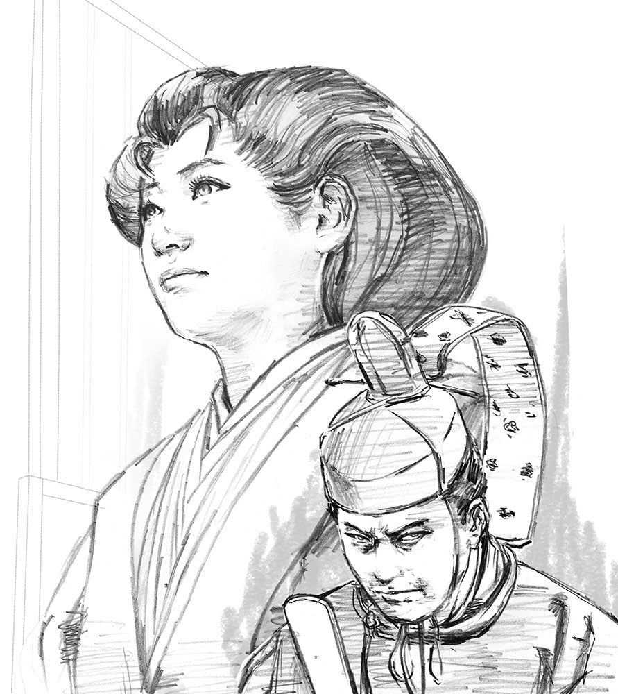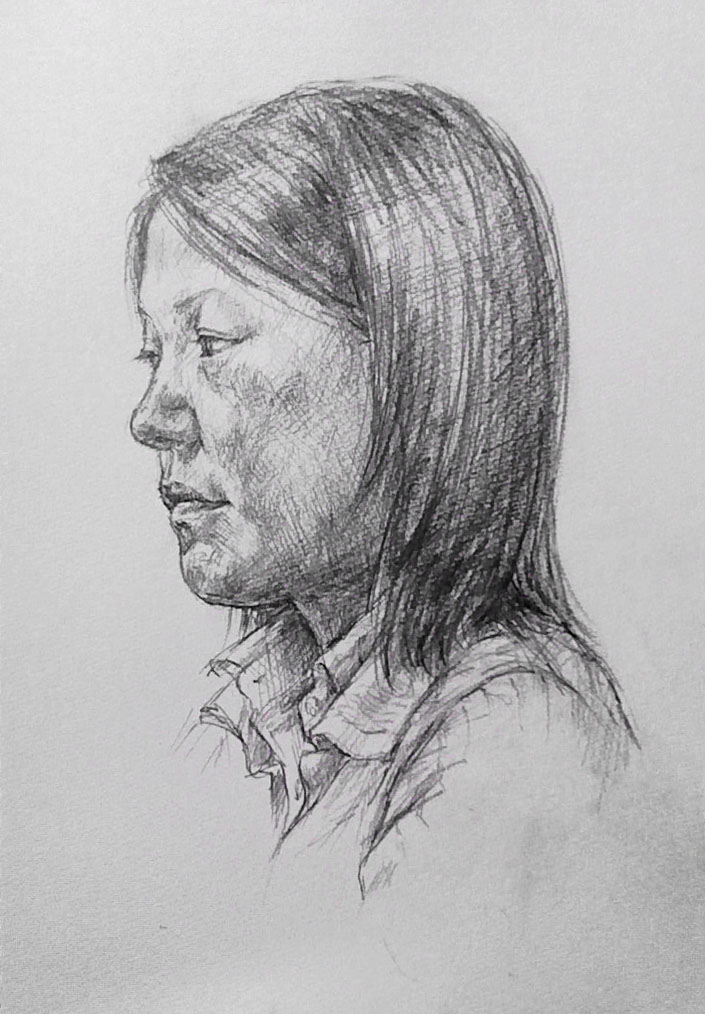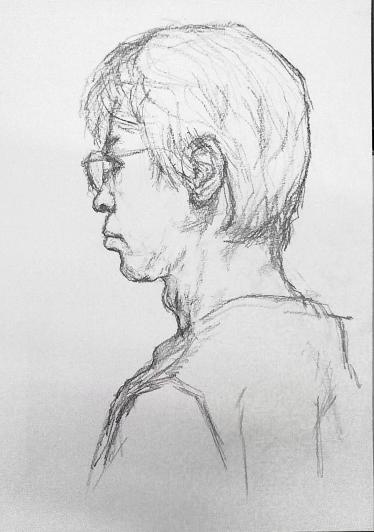 鏡2枚使うと、自分の顔も様々なアングルから見る事ができるので、横顔、斜め向き、やや後ろからを描いてみた。