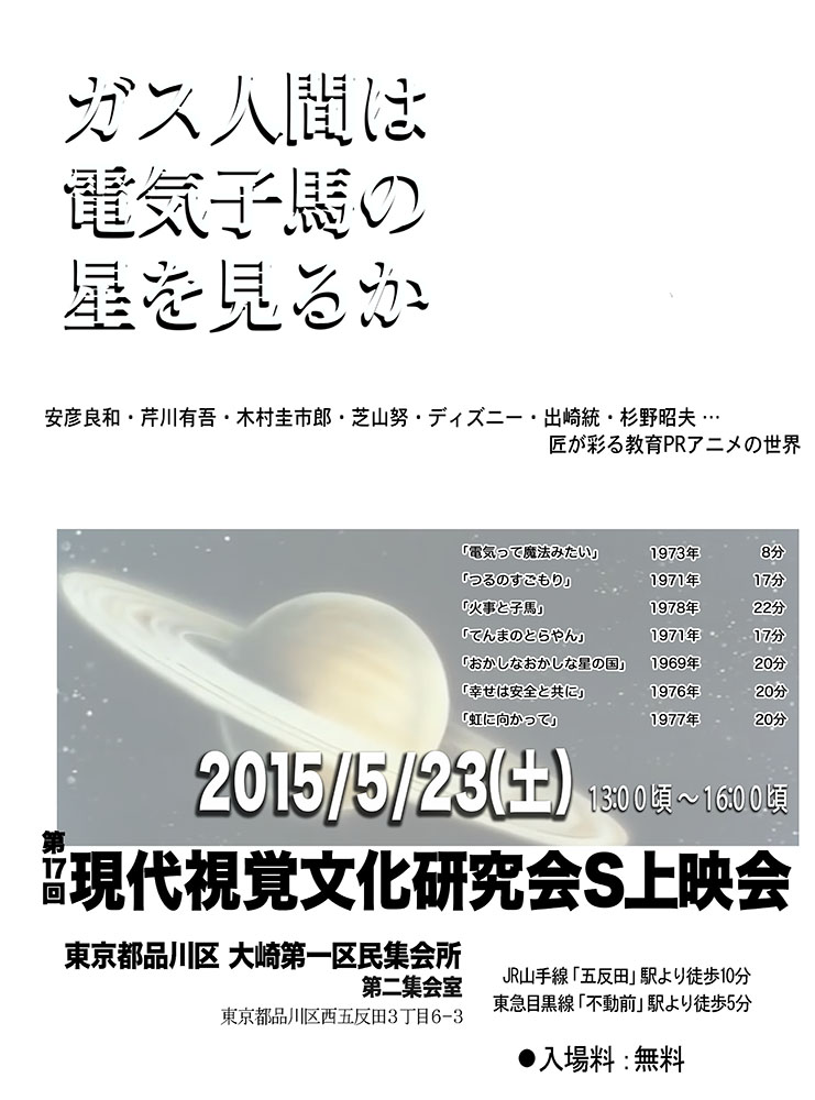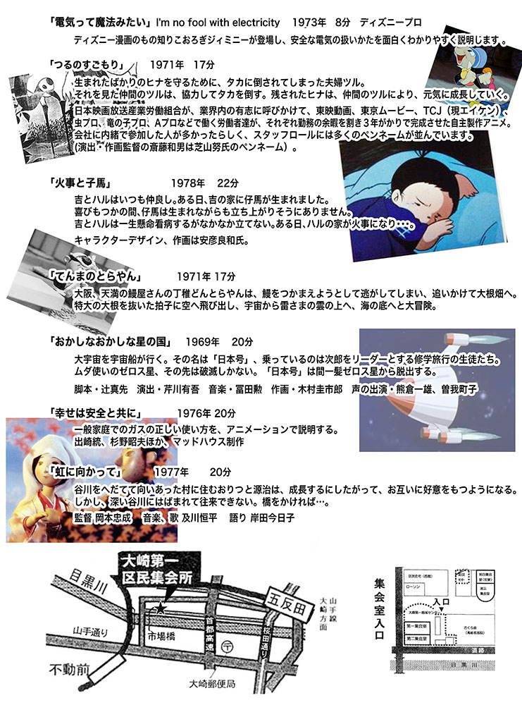 今回は防災・PR映画中心です。 観たいけれど観た事の無かったものがほとんどですので、どうなるか…… でも一度は観なければならないものばかりだと思いますので 御用とお急ぎで無い方は是非ご来場下さい。 ーーーーーーーーーーーーーーーーーーーーーーーーーーーーーーーーーーーーー ●「電気って魔法みたい」I'm no fool with electricity 1973年 8分 ディズニープロ ディズニー漫画のもの知りこおろぎジィミニーが登場し、安全な電気の扱いかたを面白くわかりやすく説明します 。 ●「つるのすごもり」 1971年 17分 生まれたばかりのヒナを守るために、タカに倒されてしまった夫婦ツル。 それを見た仲間のツルは、協力してタカを倒す。残されたヒナは、仲間のツルにより、元気に成長していく。 日本映画放送産業労働組合が、業界内の有志に呼びかけて、東映動画、東京ムービー、TCJ(現エイケン)、 虫プロ、竜の子プロ、Aプロなどで働く労働者達が、それぞれ勤務の余暇を割き3年がかりで完成させた自主製作アニメ。 会社に内緒で参加した人が多かったらしく、スタッフロールには多くのペンネームが並んでいます。 (演出・作画監督の斎藤和男は芝山努氏のペンネーム)。 ●「火事と子馬」 1978年 22分 吉とハルはいつも仲良し。ある日、吉の家に仔馬が生まれました。 喜びもつかの間、仔馬は生まれながらも立ち上がりそうにありません。 吉とハルは一生懸命看病するがなかなか立てない。ある日、ハルの家が火事になり・・・。 キャラクターデザイン、作画は安彦良和氏。 ●「てんまのとらやん」 1971年 17分 大阪、天満の鰻屋さんの丁稚どんとらやんは、鰻をつかまえようとして逃がしてしまい、追いかけて大根畑へ。 特大の大根を抜いた拍子に空へ飛び出し、宇宙から雷さまの雲の上へ、海の底へと大冒険。 ●「おかしなおかしな星の国」 1969年 20分 大宇宙を宇宙船が行く。その名は「日本号」、乗っているのは次郎をリーダーとする修学旅行の生徒たち。 ムダ使いのゼロス星、その先は破滅しかない。「日本号」は間一髪ゼロス星から脱出する。 脚本・辻真先 演出・芹川有吾 音楽・冨田勲 作画・木村圭市郎 声の出演・熊倉一雄、曽我町子 ●「幸せは安全と共に」 1976年 20分 一般家庭でのガスの正しい使い方を、アニメーションで説明する。 出崎統、杉野昭夫ほか、マッドハウス制作 ●「虹に向かって」 1977年 20分 谷川をへだてて向いあった村に住むオリツと源治は、成長するにしたがって、お互いに好意をもつようになる。 しかし、深い谷川にはばまれて往来できない。橋をかければ…。 監督 岡本忠成 音楽、歌 及川恒平 語り 岸田今日子 ーーーーーーーーーーーーーーーーーーーーーーーーーーーーーーーーーーーーー 会場はいつもの、大崎第一区民集会所、第二集会室 (山手線 五反田駅、目黒駅より徒歩10分、 東急目黒線 不動前より徒歩5分) 13時頃~16時頃まで。 入場無料ですので、よろしくおねがいします。