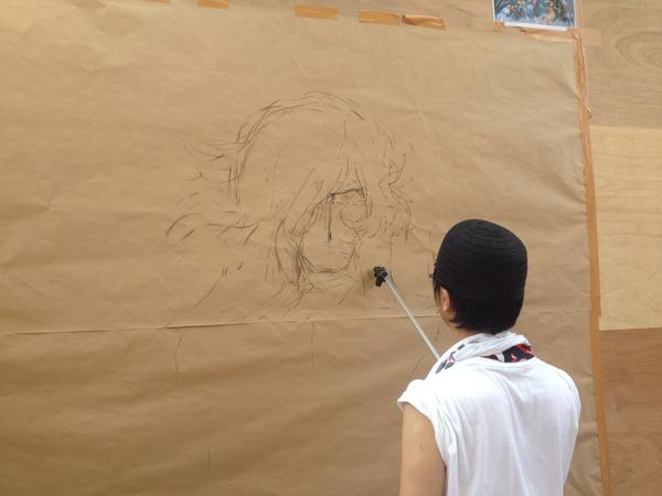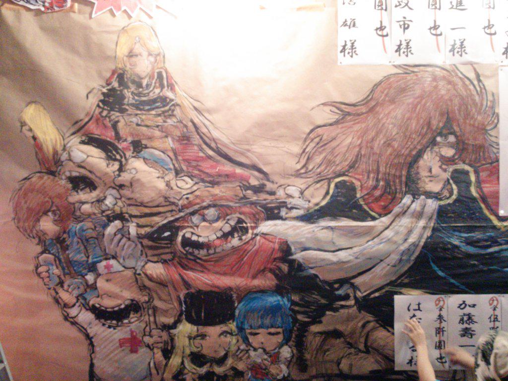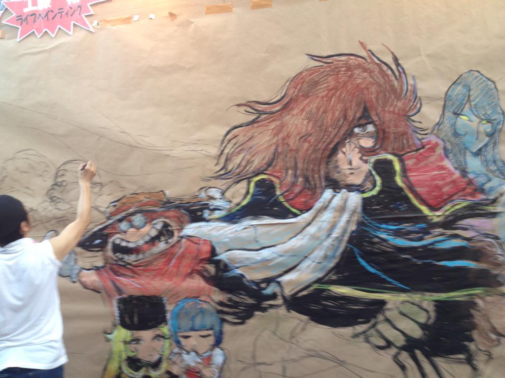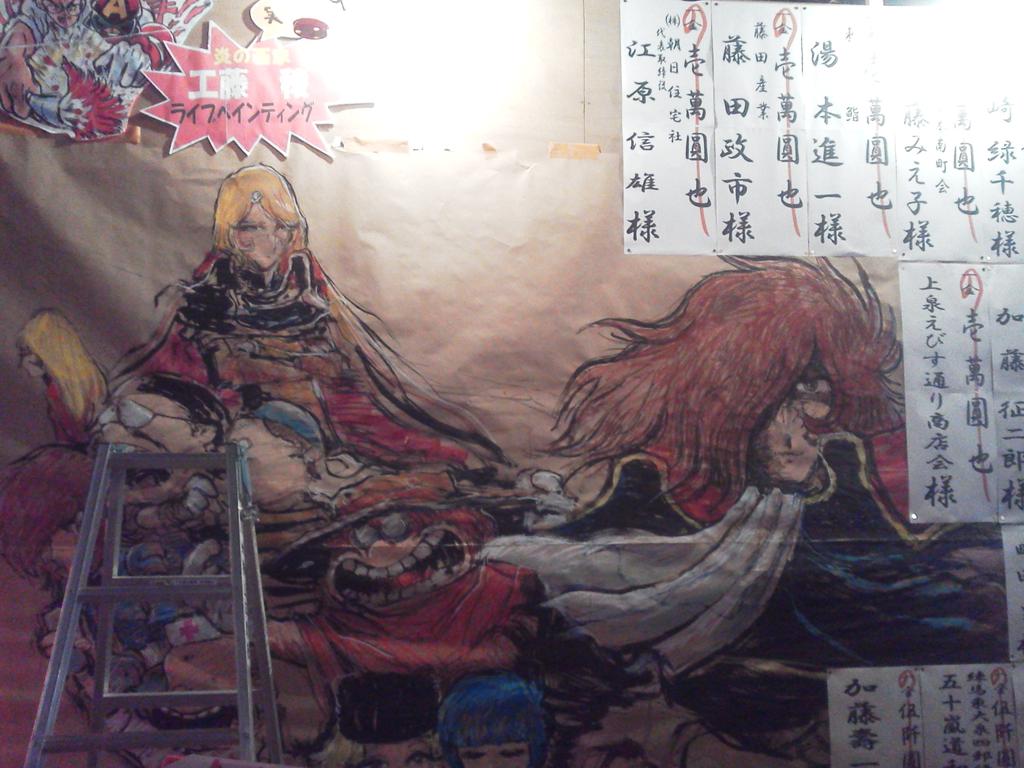 なんか自分は前より下手になったんじゃないじゃか、勢いが足りないなぁ、 なんて考えながらやっていました。 (写真はTwitter等から勝手に拾ってきたものです) という感じで進めておりましたが、困った事が起きました。 今年はお祭りへ寄付金(花かけというらしい)が昨年の倍以上もあったのです。 いやそれはもちろん良い事なのですが、 僕はそれを貼り出すための花かけ台に紙を貼って描いているのです。 お札が多くなり貼るスペースが無くなり、関係者が困っています。 「いいから絵の上に貼っちゃって下さい」 こちらが言うまでもなく、そうするしかないのです。 絵の上にどんどん貼られていきます。 なかなかスリリングで楽しくなってきました。 左側を描き進めても、右側から絵がどんどん隠されていきます。 最初はキャラの顔を外して貼ってくれていましたが メインキャラ以外はどんどん隠れていき で、最後にはハーロックの顔だけが見える状態になりました。(写真無し) 家の窓からハーロックが微笑んでいるような微笑ましい光景でした。 2日目の朝にはボードが全面、花かけで埋まっていました。 描く場所がない。これは中止か……?(つづく) PR