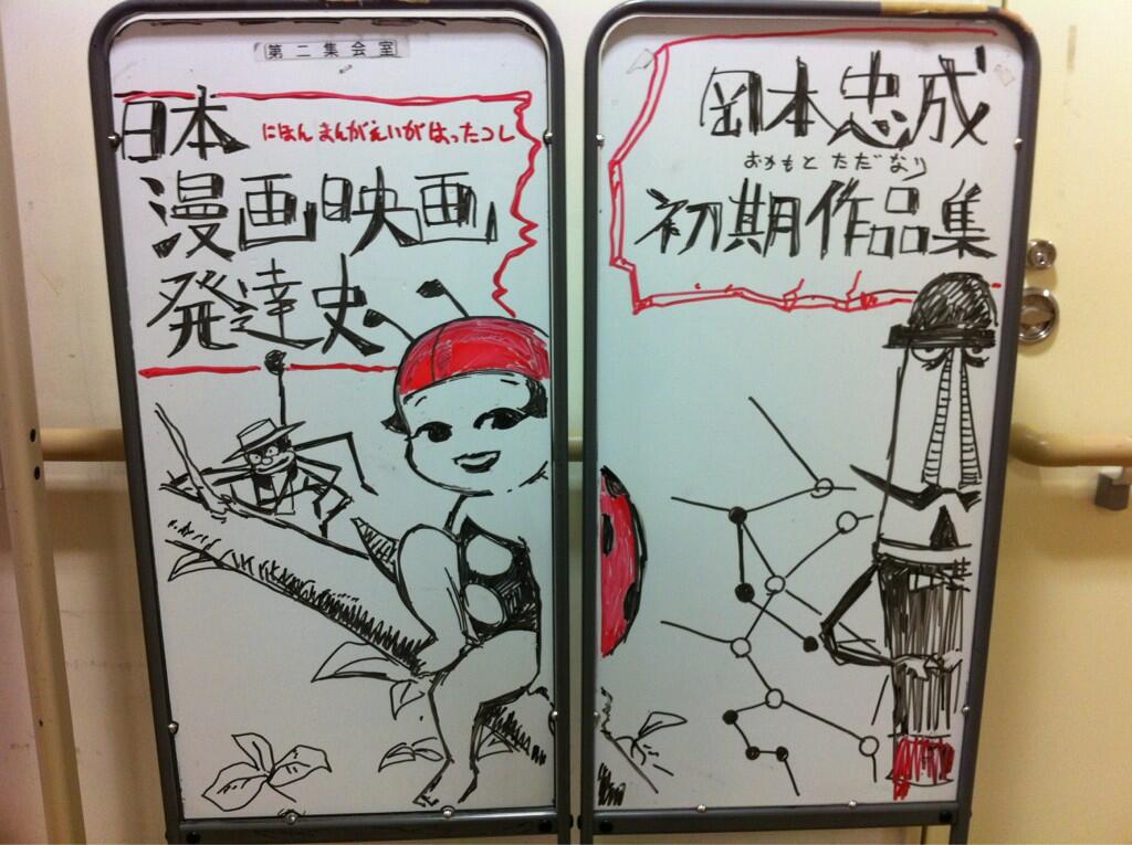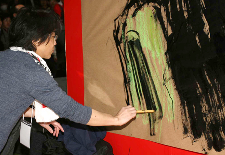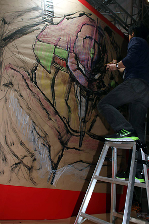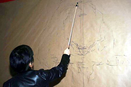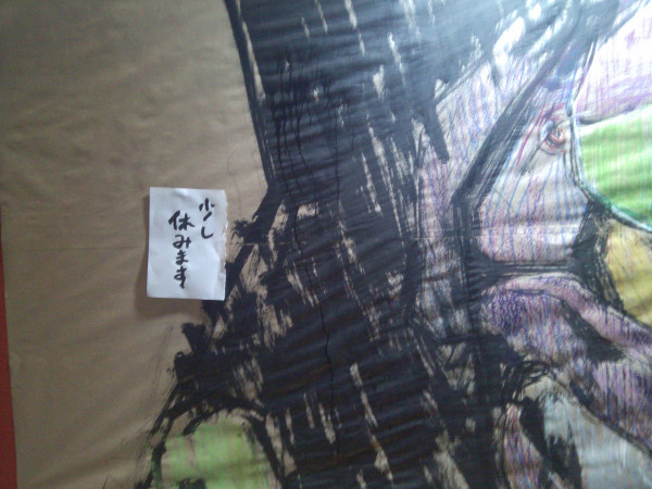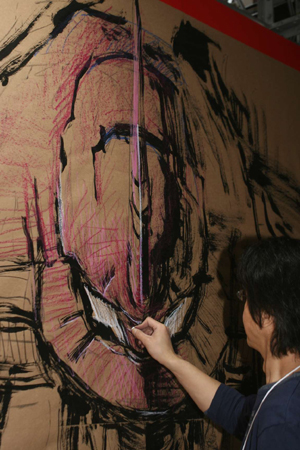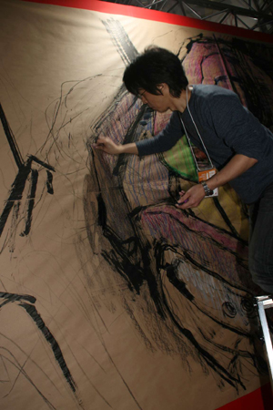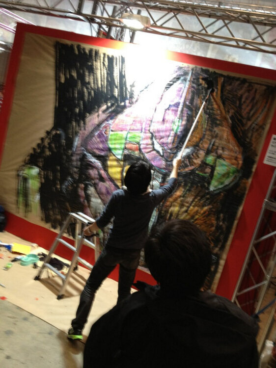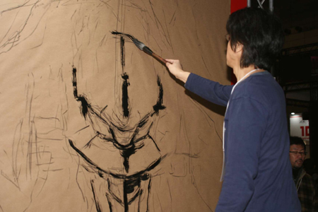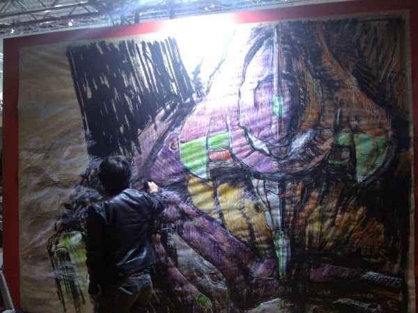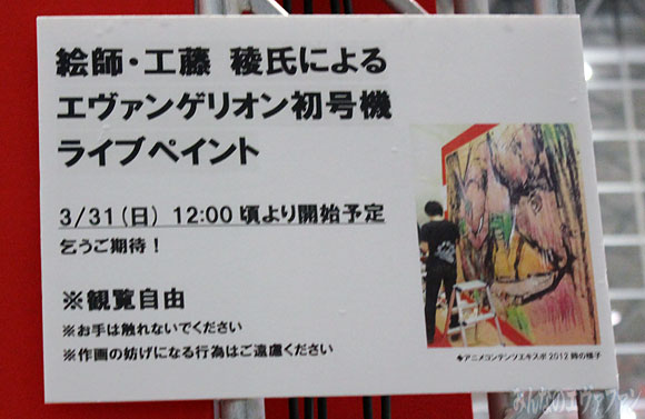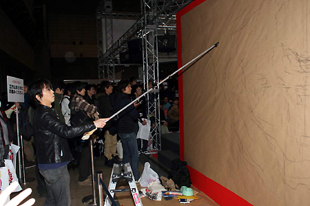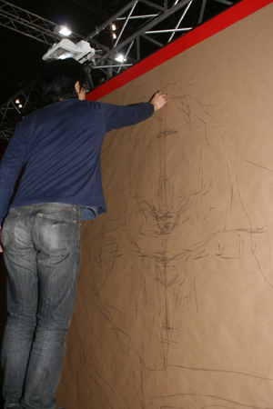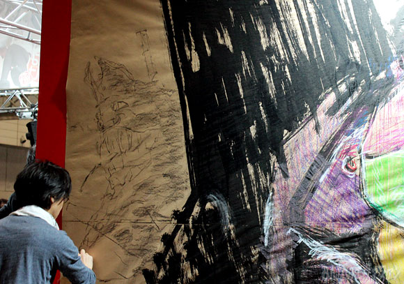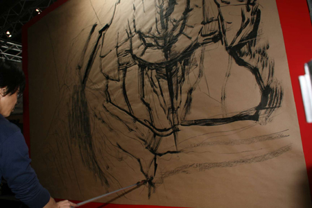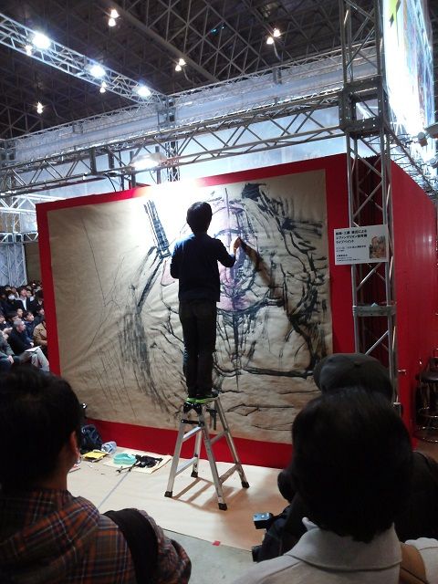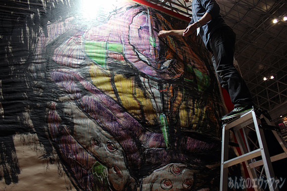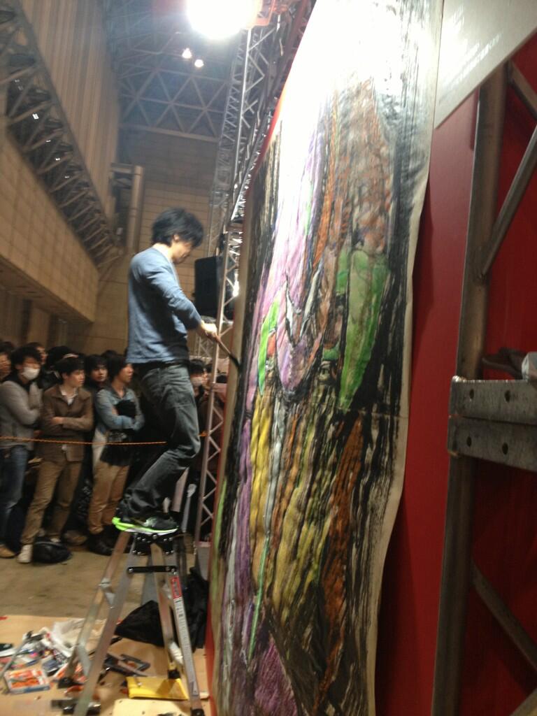 3月31日、『ACE(アニメコンテンツエキスポ)2013』の2日目に行き、スターチャイルドブースで昨年と同様でかい絵を描いてきた。 本来なら初日に描くべきだったのだが、川崎でオールナイトの歌謡イベントがあったので さすがに徹夜明けでこの仕事はできないと思い、一日ズラしてもらったのだ。 『Q』の新エヴァとか弐号機ビーストモードとかを描こうかと色々考えていたのですが、前回に続いてエヴァ初号機を描いたのは、先方からの依頼であるのです。 今回は公式サイト等での前もっての告知は一切無く、スペースの隅にこういう張り紙があっただけなのですが それでもこれを見つけてわざわざ取材に来てくれた毎日新聞の記者さんには大感謝であります。 12時頃開始とありますが、早めに着いたので11時半すぎに始めました。 今回より新兵器・アルミの棒を導入。 ホームセンターで見つけて、なんとなくいいかもと思いついたのだ。 これの先に画材をつければ、離れたところから描けて、全体の形のバランスがとりやすいかもしれないと考えたのです。 クリップ(強力洗濯バサミみたいなものです)で先端に木炭を装着。 たしかにこれは描きやすい。 高いところも大丈夫。 2本つなげて2mにしてみたが、これは使いにくかった。 形をキチンと描くためには、やはり自分の手で描かなければ。 墨入れ開始 棒の先に筆を装着。届くところも離れて描く。 お客から『おースゲー』とか声が聞こえると嬉しくなる。 「まだまだ、色が入っていないからね」と答えると『えー色つくんだ〜!』と返ってきた。 水性クレヨンで彩色。色の濃淡で立体感や重量感を出す 3歳くらいの女の子がいちばん前で観ていたので 「大丈夫?つまんなくない?」と訊くと『大丈夫』と返事をくれた。 「こわくない?」『うん』「これ、何描いているかわかる?」『エヴァンゲリオン』「そうか、偉いな」 彩色後にも墨汁で影を強調 このあたりで喉が乾いたのでポケットに入れていたフリスクを探したが、 無い。忘れてきたようだ。近くにいたスタッフの人にアメか何か持っていないかと訊くが、無いと言う。近くにいたお客がのど飴をくれた。すごく助かった。 画面右半分が未決定なまま進めていたので、考え始める 高いところも棒で便利 反射光にオレンジをいれたらいい感じになった気がする。 この辺で約2時間経過。休憩をいただく。 トイレに行って手を洗い、控え室で飲み物をもらって戻ってきた。 気がついたらヤバラ君がいた。休憩前からずっと観ていたのだという。気付かなかったなぁ。 後半、あとは全体のバランスを見ながら細部を加筆したりいろいろ。 とくに大きな進展は無いが、こういう作業は大事なのだ。 それからヤバラ君を誘ってコーヒー飲みに出かけたり。 空けた左側に弐号機を描いてみたが、やはり後付け感があるのでやめる。 煙モヤモヤを描き足す。 初号機の口から蒸気が出ているようにしたかったが、上手くいっていないみたい。 あまり細かく描き足しても効果的ではないし、むしろ絵を壊すだけなので、ここいらで終了。 開始より3時間半ほど経っていた。 最後までいてくれた新聞社の人から取材を受ける。 昨日見つけた告知が気になり、検索して調べたら、こりゃぁ是非取材しなければと休日返上で来てくれたのだそうだ。ありがたいなぁ。 記事はこちら。 http://mantan-web.jp/2013/03/31/20130331dog00m200017000c.html 今日検索したら、もうひとつ記事を見つけた。 http://neweva.blog103.fc2.com/blog-entry-2219.html こちらの人も最後までつきあってくれたのだなぁ。ありがたいやら申しわけないやら。感謝いたします。 写真は上記のリンク先とかあちこちから無断借用。 |