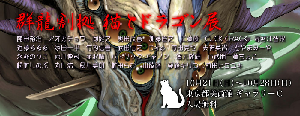 参加する皆様が何か凄い事になっているので ワタシはただ邪魔にならないよう小さくなっているだけです。 猫とドラゴン展 http://neko-dora.jp/ ■会期:2012年10月21日(日)〜10月28日(日) ■開室時間:午前9時30分から午後5時30分まで ※最終日は午後1時30分まで(入室は閉室の30分前まで) ■会場:東京都美術館 ギャラリーC ■観覧料:無料 • 開田裕治(イラストレーター) • アオガチョウ(イラストレーター) • 岡健之(造形師) • 奥田茂喜(造形師) • 加藤直之(イラストレーター) • 工藤稜(イラストレーター) • CLICK CRACK(ぬいぐるみ作家) • 寒河江智果(日本画家) • 近藤るるる(漫画家) • 添田一平(デザイナー・イラストレーター) • 竹内信善(造形作家) • 武田信之(原型作家) • Deino(3DCGイラストレーター) • 寺田克也(イラストレーター) • 天神英貴(イラストレーター・デザイナー) • とやまみーや(イラストレーター・日本文芸家クラブ理事) • 永野のりこ(漫画家) • 西川伸司(漫画家・デザイナー) • 韮沢靖(クリーチャーデザイナー・デザイナー) • パトリック・ギャノン(切り絵作家) • 濱元隆輔(漫画家・イラストレーター) • 百武朋(特殊メイク・特殊造型作家・キャラクターデザイナー) • 藤ちょこ(イラストレーター) • 前田ヒロユキ(イラストレーター・造形師) • 松村しのぶ(モデラー・原型師) • 緑川美帆(イラストレーター) • 村田らむ(ライター・イラストレーター・漫画家) • 山脇隆(造形作家) • 夢路キリコ(イラストレーター・漫画家) • 打田十紀夫(フィンガースタイル・ギタリスト) • 八尋健生(作曲家・編曲家・不気味社代表) |