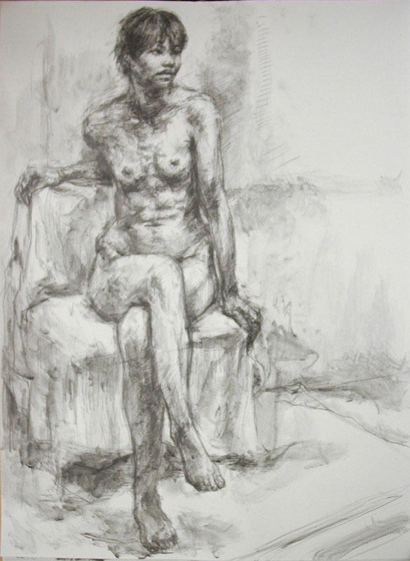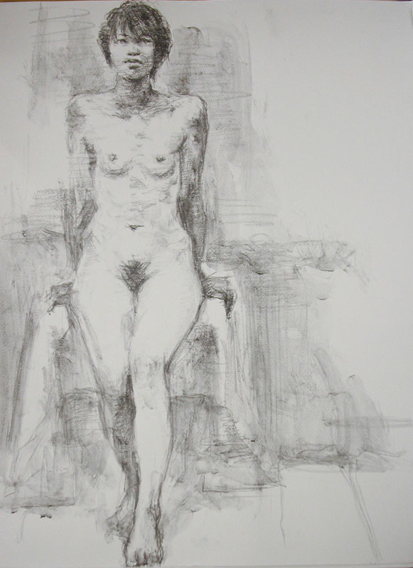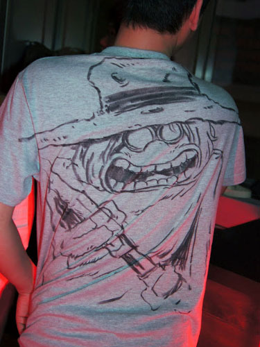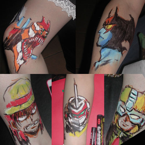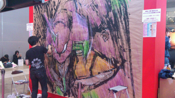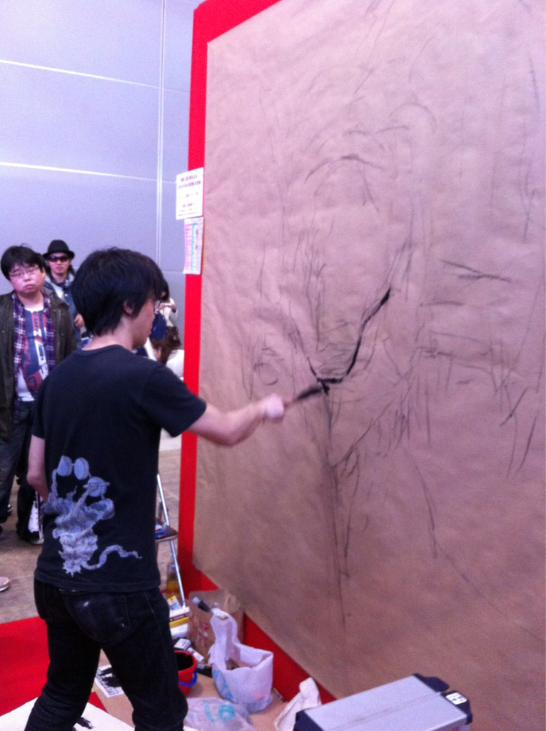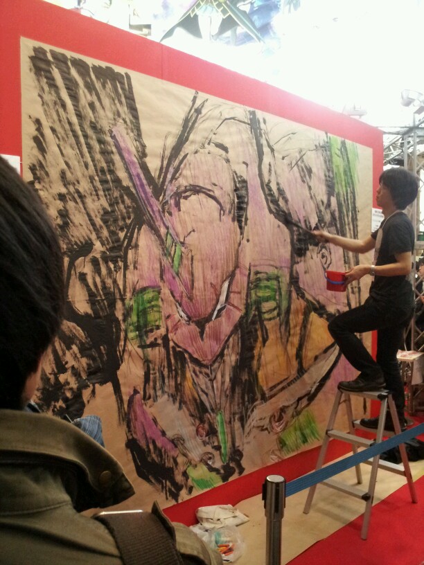 現場で貼られた紙を見て、まずはその大きさに参った。脚立に上ってやっと上に手が届く程だ。まぁ足りないより良いか、余ったらそこに別の何かを描こうと考えた。 モチーフはエヴァ初号機・新劇場版だ。すでに版権許諾済みだ。後ろめたさも何も無く描く事ができるのだ。 予定通り12時に開始する。壁面前にはビックリするくらい大勢の人が待っていた。とりあえずはじめる前に挨拶する。「じゃあ頑張ります。頑張って描きますので、もし失敗しても許して下さい。」「よそのイベントには声優さんとかが来ていて、そっちに行った方がきっと面白いですよ。」と、挨拶だか言い訳だかわからないものをしていたが、最前列にいた少年が「僕はこれが見たいんです!」と力強く言ってくれた。 「ありがとう!今日は君のために描くよ!!」と言い描き始める。 紙はでかいし後ろに下がれないしで難儀する。まずいなぁ。今何を描いているんだかわかんなくなってきた。仕方がないのでお客の方に掻き分けて入って行き、なんとか全景が見られた。 形の狂いにも気がつく。近くにいた兄さんに「あれ、右の方が大きすぎてへんじゃないですか」と訊くが「いや大丈夫ですよ」と言ってもらえる。でも気付いたところは直す。 最初の構想と全く違うものになったが、戻している時間がもったいない。とりあえず顔だ。人物は顔がしっかり描ければなんとかなるものだ。ロボットもモビルスーツも、汎用人型決戦兵器も人物のようなものだ。 なんだか顔がはみ出る程大きくなってしまった。紙が小さすぎるんだよこれでは。もっと大きい方がいいのに。最初と言っている事が変わったが、描いているうちに気が変わるのはいつものことだ。 時々振り向くと、あいかわらず人がたくさんいるので、嬉しいやら申し訳ないやら。カメラを抱えている人が多く見られるので注意する。「写真とっている方にひとつお願いがあります。ブログとかツイッターに乗せる時は、褒めて下さい。人間は褒められて伸びるものです。貶されたら悲しいものです。僕は褒められるのが大好きですので是非お願いします。」 聞いて貰えたのだろう。ツイッターで褒めてくれる人がたくさんいた。 途中段階が紹介されているものがいくつかありました。 こんな感じで描いていたのですね。 http://neweva.blog103.fc2.com/blog-entry-1493.html http://nuruwota.blog4.fc2.com/blog-entry-2142.html http://www.kotaku.jp/2012/03/aya_kudo_eva_ace2012_1.html イベント自体は18時まで開催されているので、のんびり描こうかと考えていたのだが、1時間半程でほぼ出来てしまった。 お客さん達にほぼ完成だと宣言し、拍手を貰って終了した。 あとは画材を片付けながら、気になったところを時々直したり、 離れたところから通行人の反応を眺めたりしていた。 撮影している人が多かったので、概ね受け入れてもらえたのだろう。 こんな企画を立てて下さったスターチャイルドの皆様には、もう感謝の言葉しかありません。 |