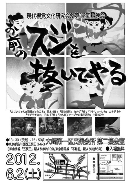 16mmフィルムによるアニメーション上映会です。 主な上映作品:わんぱくナージャの竜王退治(中国1979年) ほか海外各国の短編です。 現代視覚文化研究会S 第12回上映会 「お前のスジを抜いてやる」 ○6月2日(土) ○場所:東京都品川区大崎第一区民集会所 第二集会室 東京都品川区西五反田3丁目6−3 http://bit.ly/c5gwOE JR山手線 五反田駅より徒歩10分 目黒駅より徒歩10分 東急目黒線 不動前駅より徒歩5分 ○料金:無料 ○開始時間:13時30分頃〜15時30分くらい 上映作品 ●おじいちゃんが海賊だったころ (4分) 1968年 日本 岡本忠成 木彫りの人形アニメ。歌にあわせたおじいちゃんのホラ話。 ●マトリョーシカ (5分) 1970年 カナダ コ・ホードマン ロシアの入れ子人形が音楽に合わせて踊ったり並んだりするアニメ。 ●モチモチの木 (17分) 1982年 日本 岡本忠成 和紙に着彩した、半立体人形アニメ。 しかしウチの上映会はいつも岡本作品が多いな。 ●海の法則 (7分) 1975年 カナダ これが全くわからない一本ですが上映します。 沖縄海洋博のために作られたらしいです。 ●わんぱくナージャの竜王退治 (60分)1979年 中国 王樹枕、巌定憲、徐景達 今回のメイン作。邦題は「ナーザの大あばれ」の方が通りが良いかも。 「ナージャと竜王」「ナーザが海を騒がす」等の邦題も全て同作品。 京劇を思わせる音楽とアクションの痛快娯楽作。 あらすじ 蓮のツボミから、光とともに生まれてきたナーザ。ひどい干ばつの年、都の人々は海底の竜王に供物を捧げて雨乞いをするが、力づくで子供たちをさらおうとする邪悪な竜王の前に、ナーザが立ちふさがるが……。 (フィルムの状態によっては、プログラムが若干変更の可能性もあります。) ご用とお急ぎの無い方、どうぞ御来場下さい。 PR