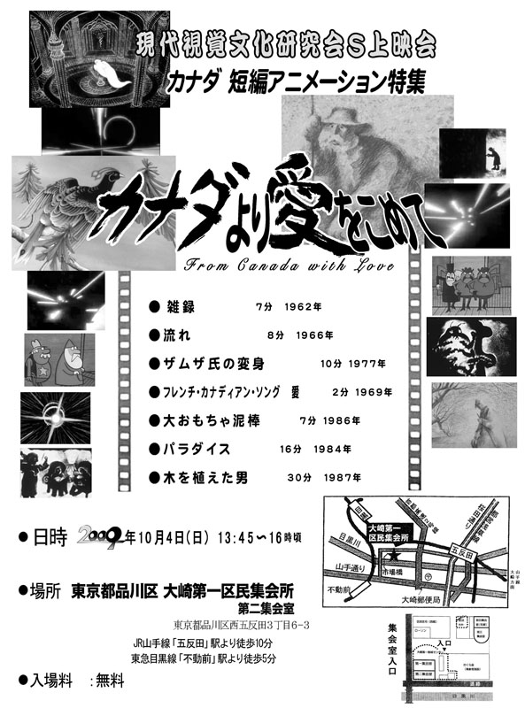 お時間とご興味のある方はどうぞ御来場下さい。 現代視覚文化研究会S上映会 カナダ短編アニメーションフィルム特集 ・日時 :10/4(日)13:45〜15:50頃 ・場所 :東京都品川区 大崎第一区民集会所 第二集会室 (東京都品川区西五反田3-6-3) JR山手線「五反田」駅より徒歩10分 東急目黒線「不動前」駅より徒歩5分 ・入場料 :無料 ・上映作品: 「雑録」(1962) 「流れ」(1966) 「ザムザ氏の変身」(1977) 「フレンチ・カナディアン・ソング 愛」(1969) 「大おもちゃ泥棒」(1963) 「パラダイス」(1984) 「木を植えた男」(1987) ・会場地図 ((A)と書いてある所です。) ・道順図解 個人的には五反田駅からが一番行きやすいと思うのですが http://tmug.jp/oosakiFudo/ |
